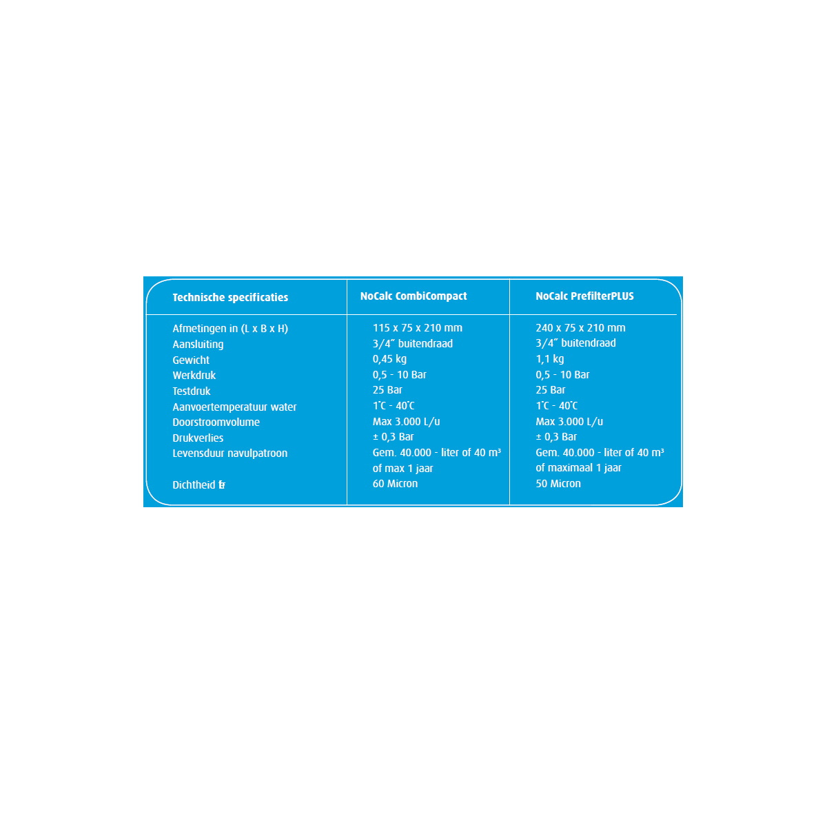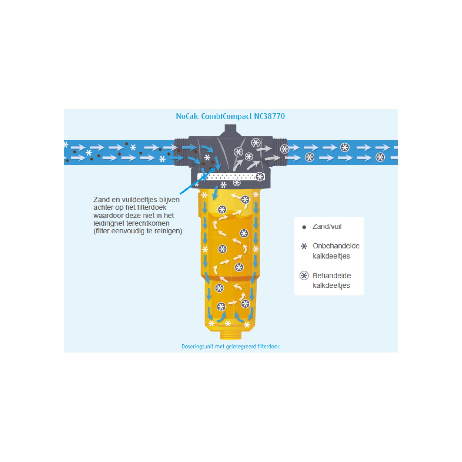 Het NoCalc-doseringstoestel is zeer effectief tegen de opbouw van kalkaanslag en is bovendien voorzien van een internationaal goedgekeurde Watts terugstroombeveiliging. Maar ook andere stoffen zoals zand en meegevoerde vuildeeltjes kunnen uw drinkwater vervuilen en de smaak negatief beïnvloeden. Het extra NoCalc geïntegreerd filterdoek voorkomt dat eventueel meegevoerde vuildeeltjes en onzuiverheden in uw leidingsysteem komen en garandeert tevens de optimale werking van het doseringstoestel. Samen verlengen zij de levensduur van uw sanitaire installaties, zoals mengkranen, warmwatertoestellen, leidingen en pompen.