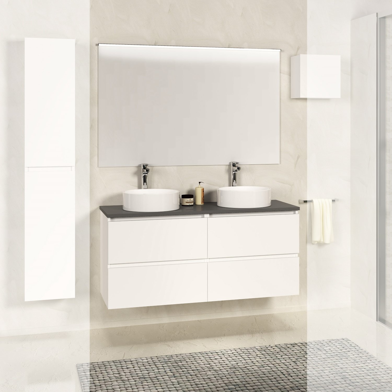 De onderkast is matglans gelakt en heeft een dikte van 16 mm. De onderkast is voorzien van soft-close geleiders voor de laden. De spiegel wordt ook meegeleverd en is voorzien van LED-verlichting (zonder schakelaar) in een kroonlijst.