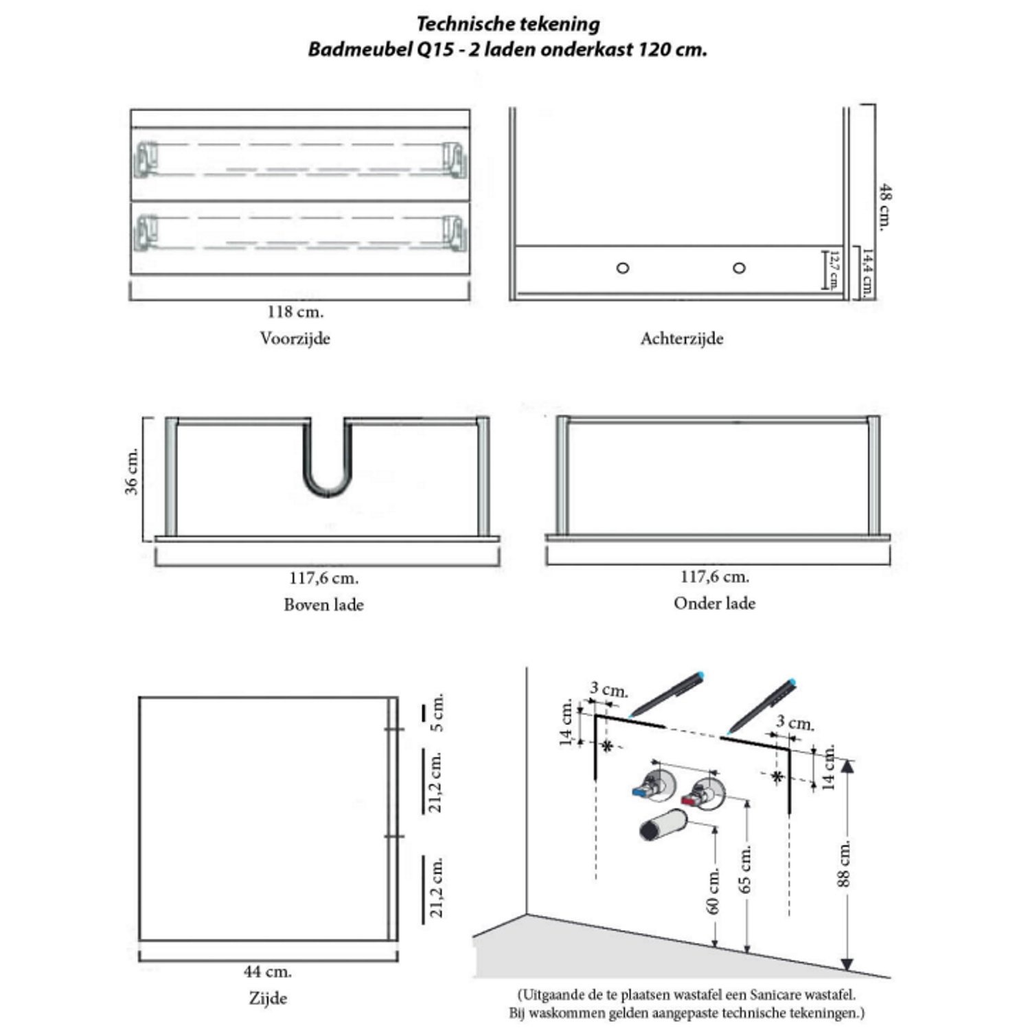 De onderbouwkast heeft een breedte van 120 cm, een diepte van 45 cm en een hoogte van 49,55 cm. Verder is de kast afgewerkt in de kleur Belluno-Eiken, wat een sfeervolle ambiance aan uw badkamer zal geven.