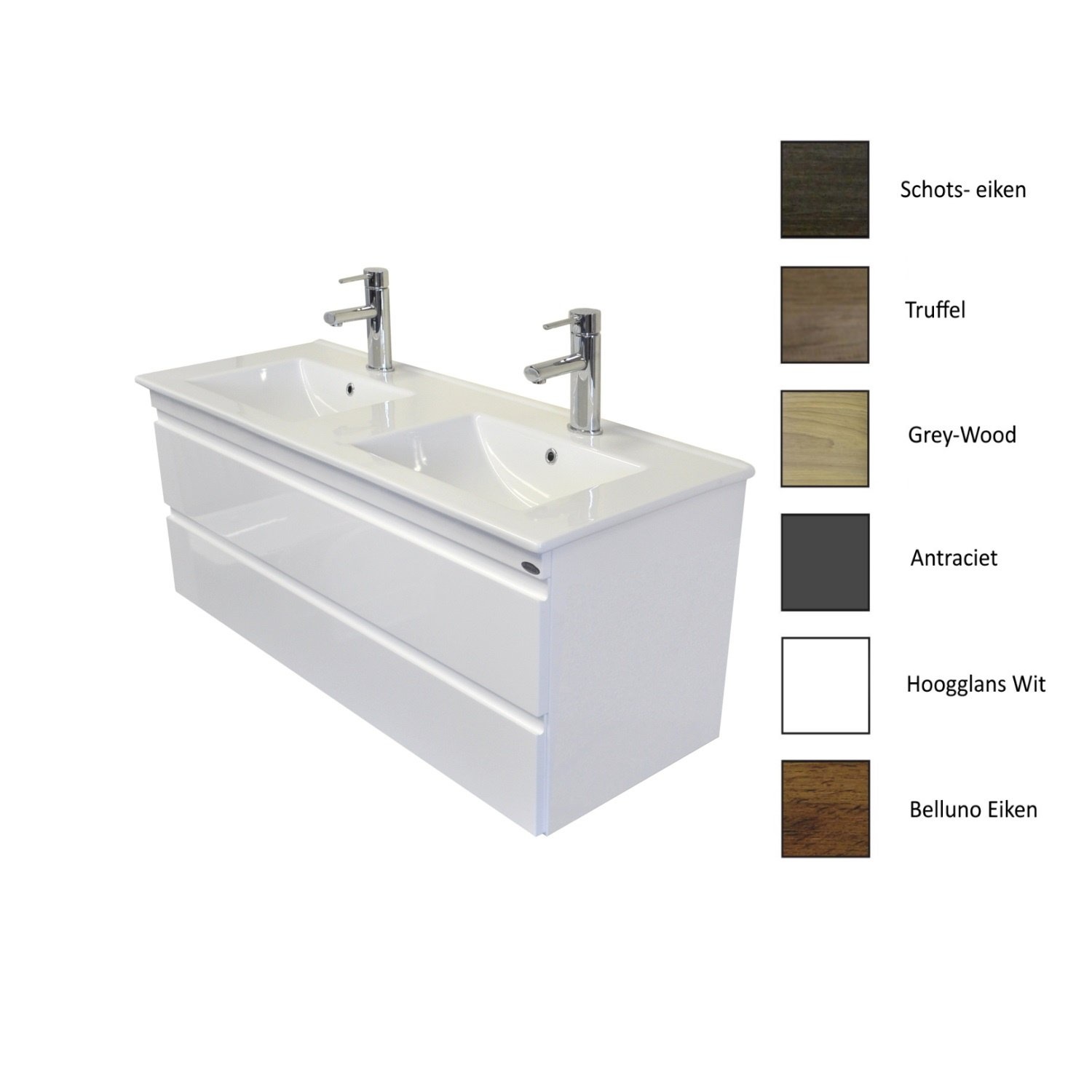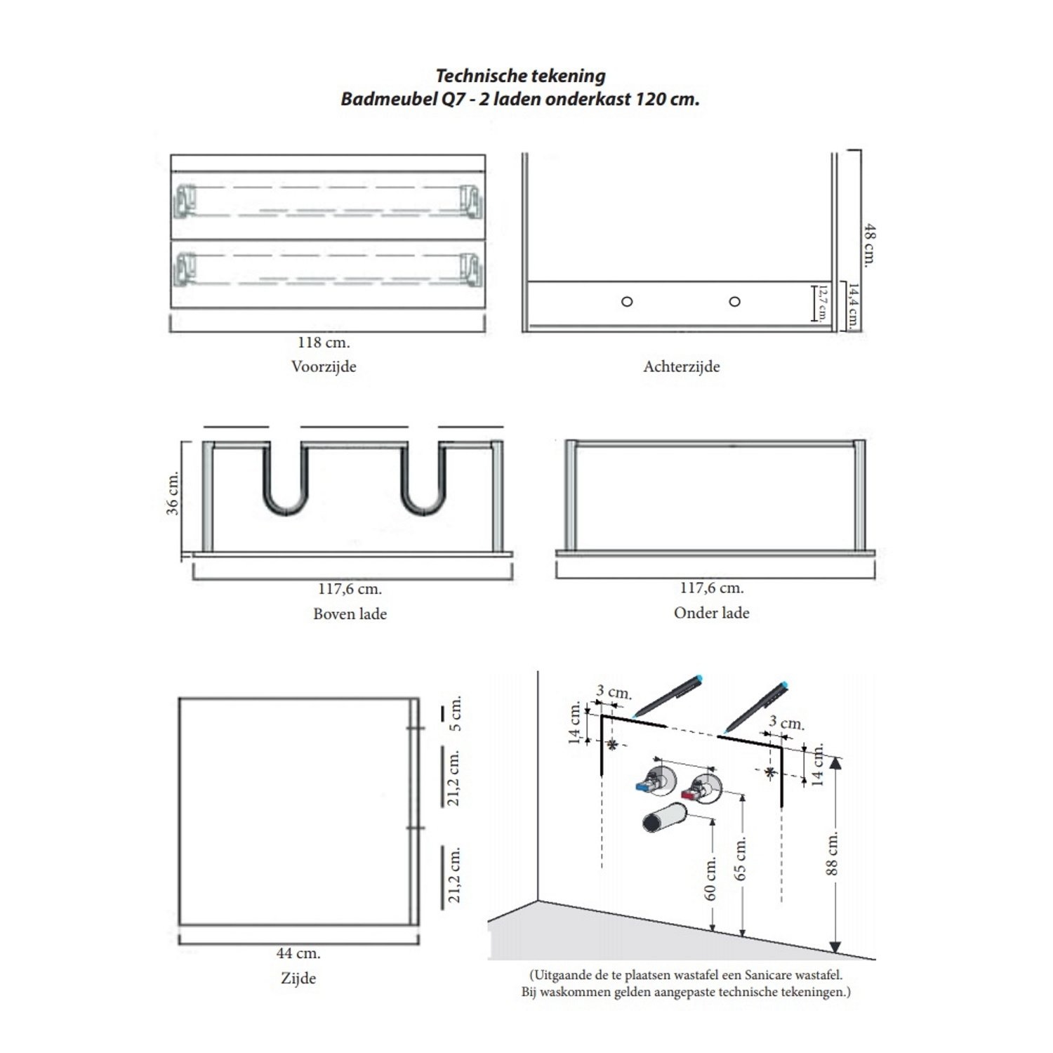 De onderbouwkast heeft een breedte van 121 cm, een hoogte van 50 cm en een diepte van 46 cm. Verder is de kast afgewerkt in de kleur Belluno-Eiken, wat een sfeervolle ambiance aan uw badkamer zal geven. De onderkast behoort tot de Q7-serie van het merk Sanicare en is perfect te combineren met andere producten uit deze serie.