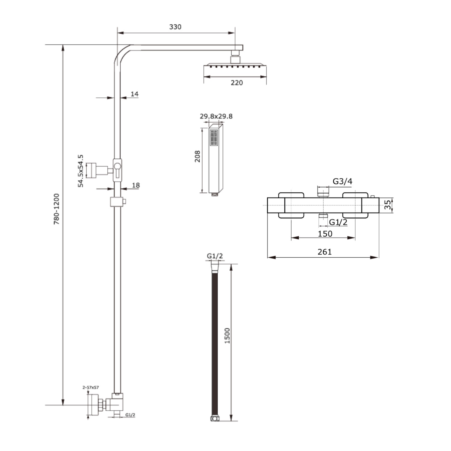 De set bestaat uit een thermostatische douchekraan, een glijstang, een ronde hoofddouche en een handdoucheset. De handdoucheset is voorzien van een flexibele doucheslang, een staaf handdouche en een handdouchehouder. De houder bevestigt u op de glijstang en is in hoogte verstelbaar.
