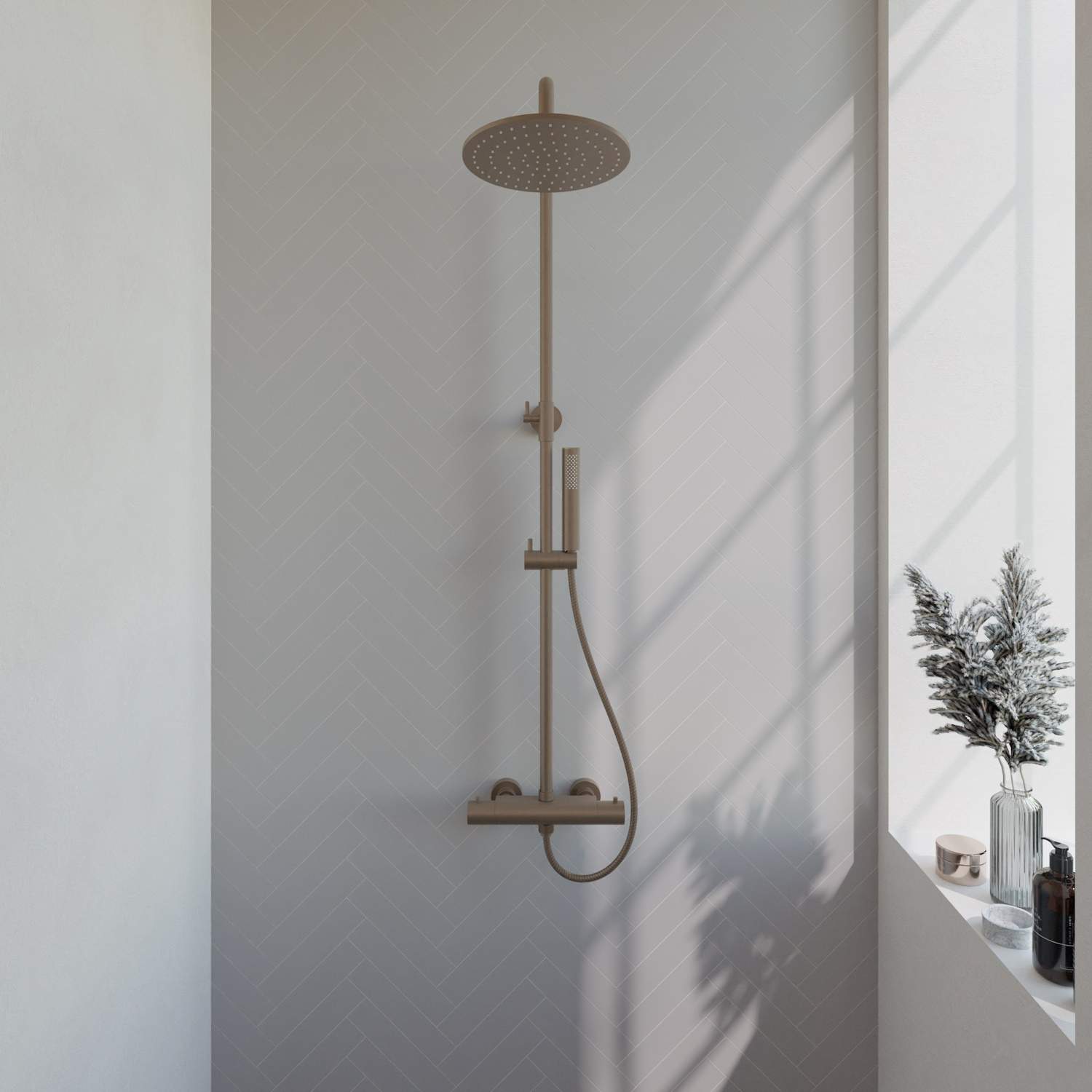 Deze complete regendoucheset is van het merk Wiesbaden en behoort tot de serie Caral. De opbouw regendoucheset bestaat uit een thermostatische kraan, een glijstang met uitloop, een ronde hoofddouche en een handdoucheset. Alle elementen uit deze regendoucheset zijn afgewerkt in de kleur koper, wat deze regendoucheset geschikt maakt voor zowel de moderne als de industriële badkamer.