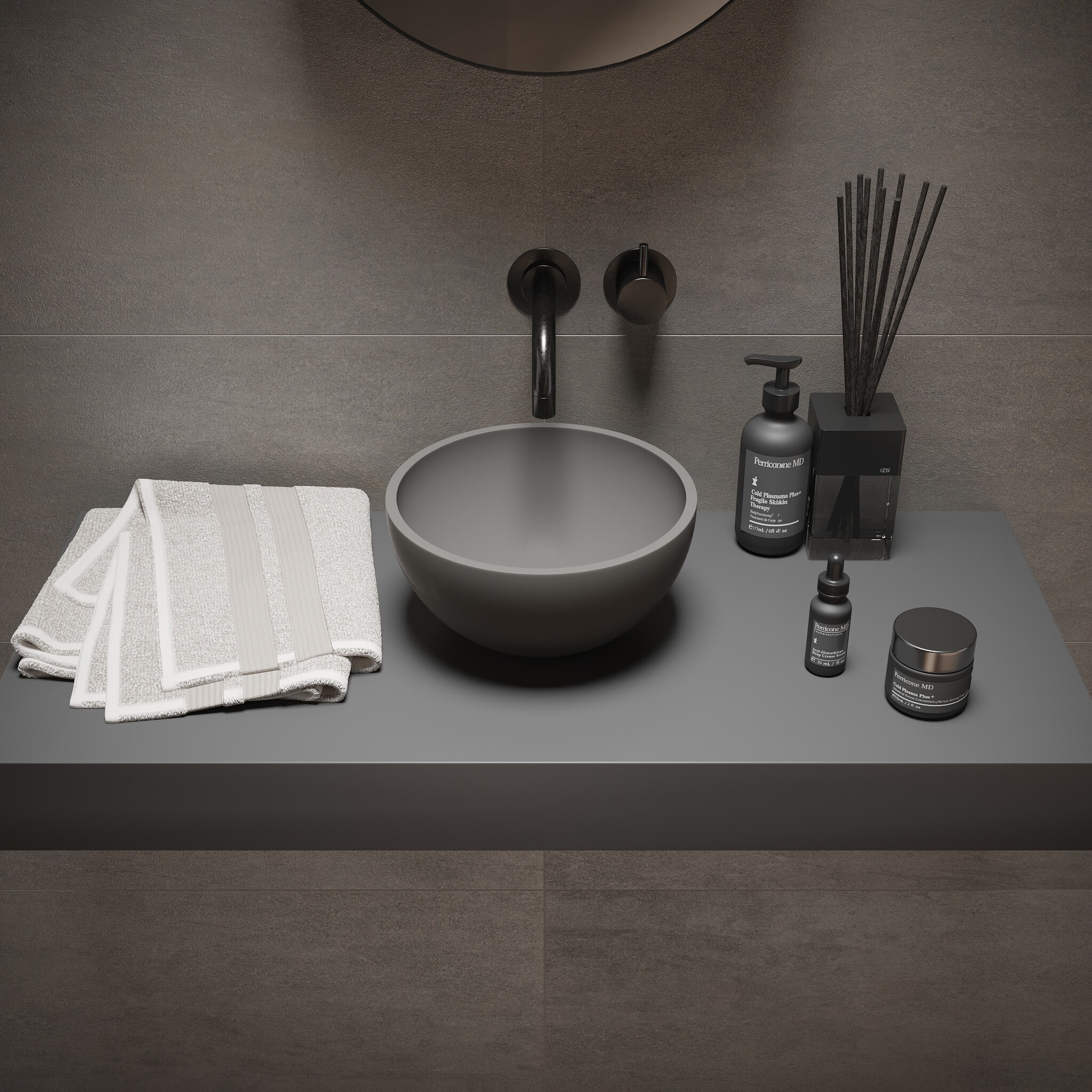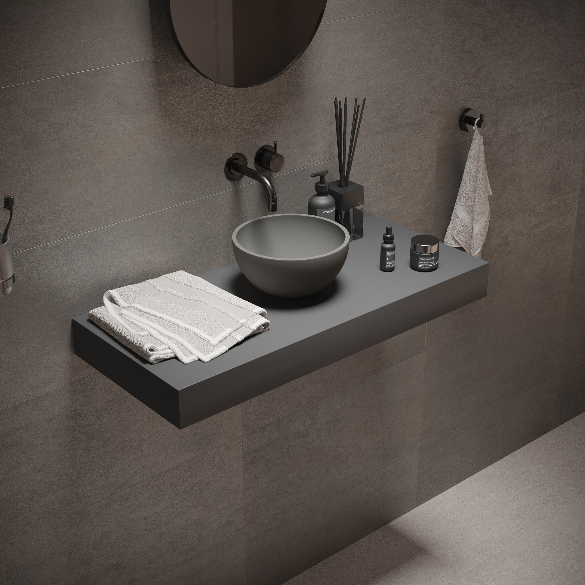 Deze opbouw waskom heeft een matte donker grijze kleur en een dunne rand van 8 mm. Het matte, fluweelachtige oppervlak van de wasbak voelt prettig aan en is makkelijk schoon te maken en te onderhouden.