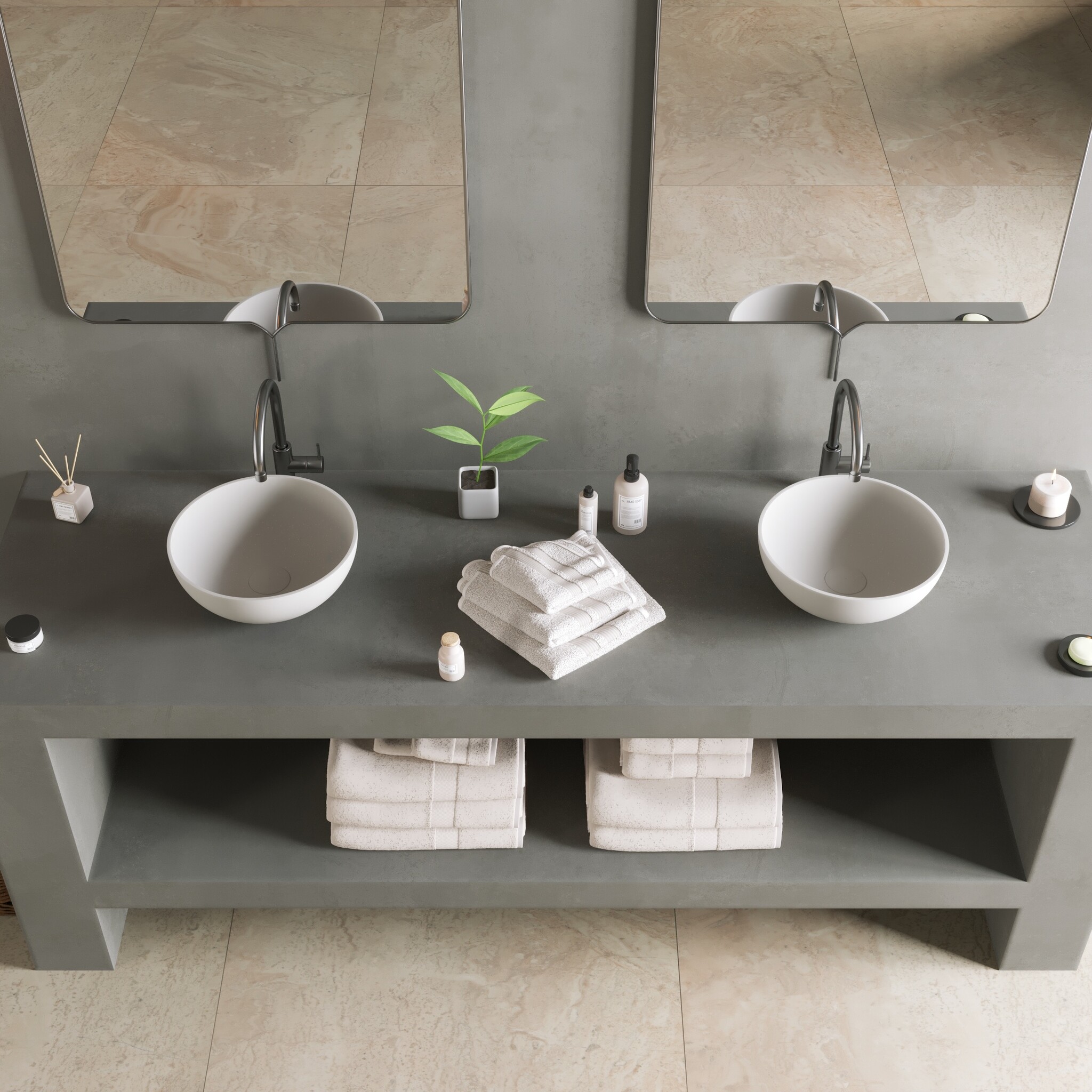 Deze opbouw waskom is geproduceerd in de kleur mat wit en heeft een ronde vorm. De hoogte van deze waskom bedraagt 12.5 cm, de diepte 32 cm en de breedte 32 cm. Het matte, fluweelachtige oppervlak van de wasbak voelt prettig aan en is makkelijk schoon te maken en te onderhouden.