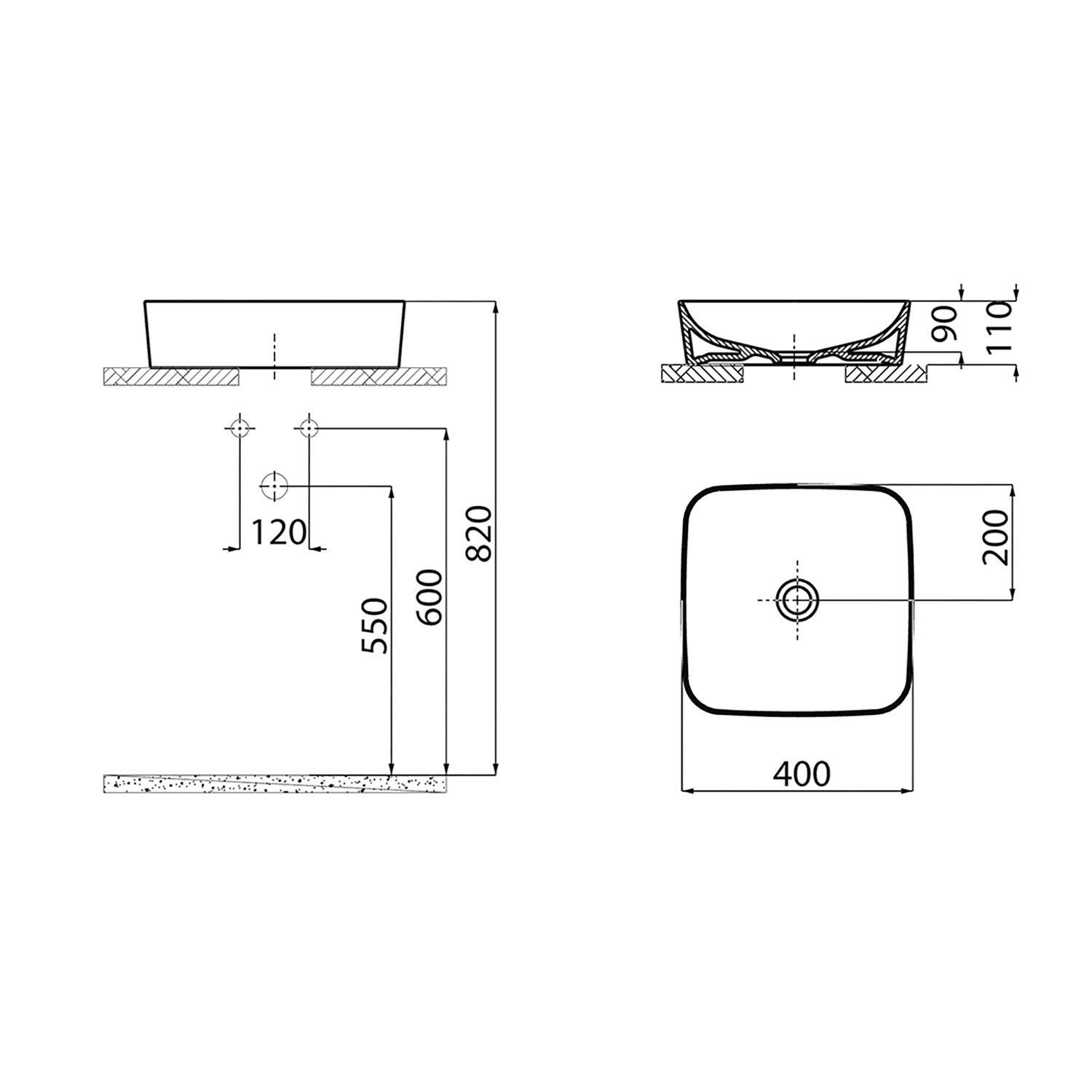 De waskom heeft een breedte van 40 cm, een diepte van 40 cm en een hoogte van 11 cm. De waskom beschikt niet over een kraangat of overloop. De wastafel is gemaakt van keramiek wat ervoor zorgt dat deze makkelijk in onderhoud is. Keramiek is een hard gebakken materiaal, vuil zal hier niet intrekken. Dit alles zorgt ervoor dat het materiaal hygiënisch is en zijn kleur goed zal behouden.