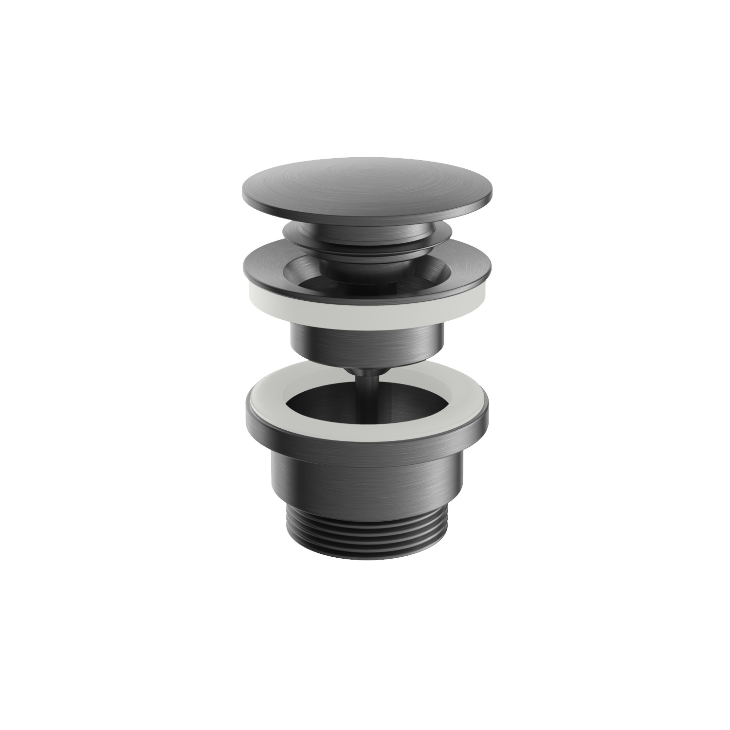 Het is een Clickplug. Dat houdt in dat u hem alleen maar hoeft in te drukken om ervoor te zorgen dat water niet door kan lopen. De plug heeft een diameter van 6.3 cm en heeft de kleur Geborsteld Gunmetal PVD.