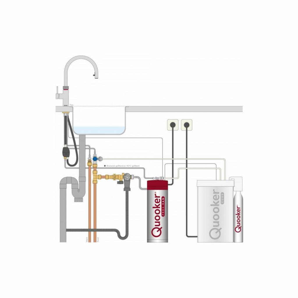 Wie veel mineraalwater drinkt, is met een Quooker die bruisend water geeft, een stuk goedkoper uit, dan met waterflessen uit de winkel. De kosten voor vier CO2-cilinders, die je nodig hebt om bruisend water uit je Quooker te kunnen tappen, zijn €70. Samen zijn ze goed voor 280 liter bruisend water. Dat is €0,25 per liter. Het gefilterde water kost €0,03 per liter. Stel dat jullie thuis acht liter bruisend en vier liter gefilterd water per week drinken en een liter mineraalwater € 0,50 kost. Dan bespaar je meer dan €200 per jaar.
