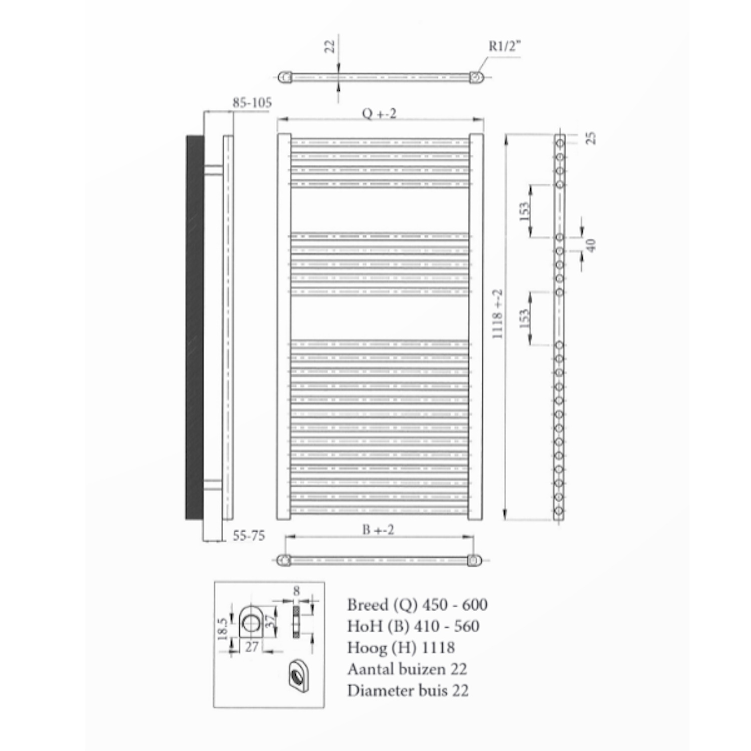 De radiator heeft een hoogte van 111,8 cm en een breedte van 60 cm. De radiator is te bestellen in de kleuren wit, Gunmetal, inox-look, zilver-grijs en zwart. De thermostaten zijn in de kleuren chroom, zwart en wit te verkrijgen.
