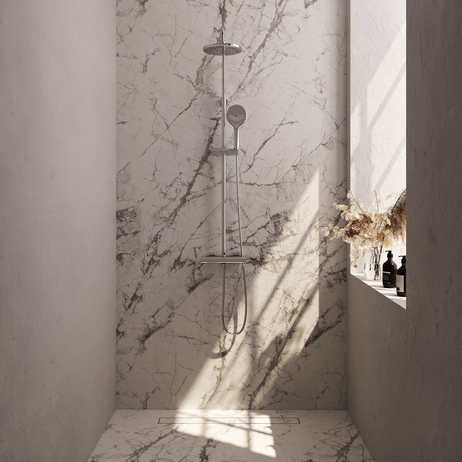 De complete regendouche set is voorzien van een thermostatische mengkraan, douchekop met een doorsnee van 20cm, verstelbare muurbuis, S-koppelingen en rozetten. De doucheset is gemaakt van messing en het heeft een nikkelkleurige en geborstelde afwerking.