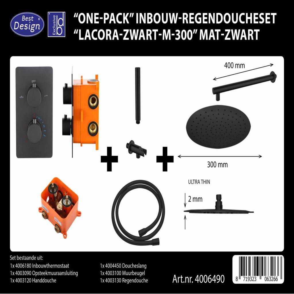Deze 'One-Pack Lacora M-300' regendouche inbouwset is van het populaire merk Best Design. De inbouwset is volledig afgewerkt in de populaire kleur mat zwart, een kleur die steeds vaker voor komt in de moderne badkamer. De set wordt compleet geleverd met diverse artikelen. Zo is de inbouwset uitgerust met een inbouwbox, een metalen handdouche, een doucheslang gemaakt van kunststof (lengte: 150 cm) en een metalen muurbeugel (40 cm). Bovendien is de regendouche voorzien van ingebouwde filters en keerkleppen.