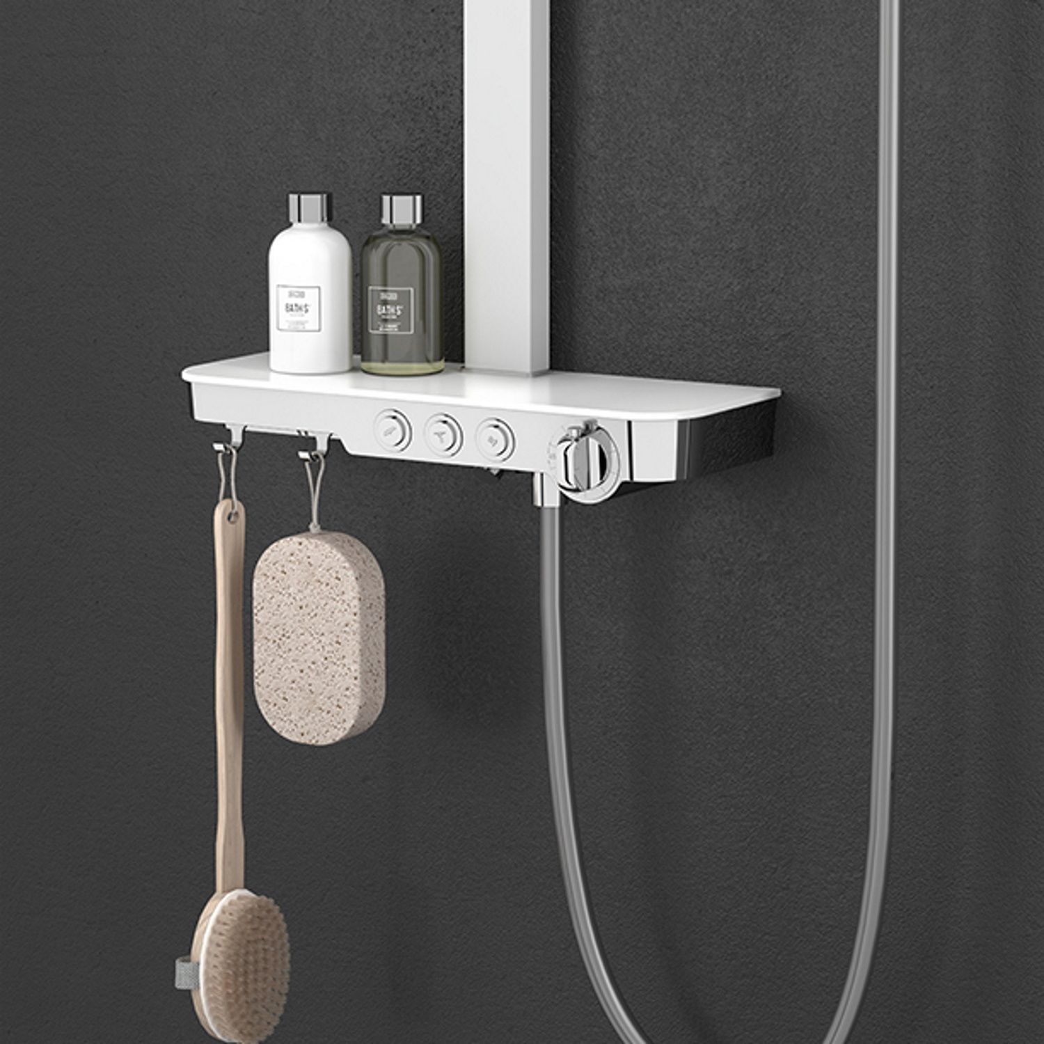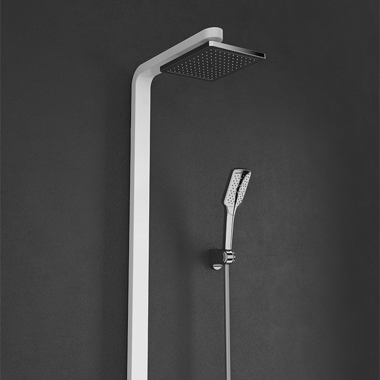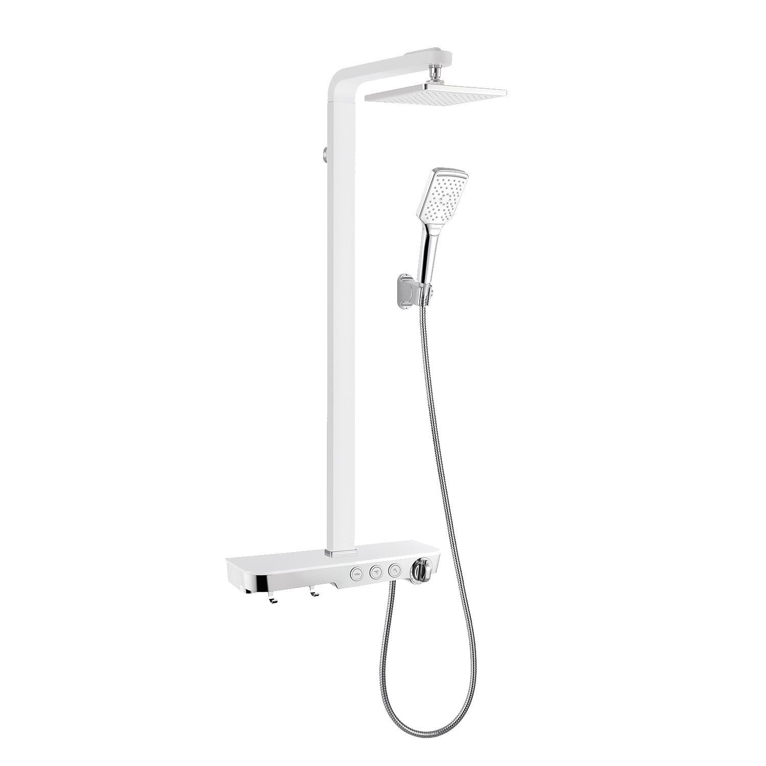 Door de regendouche kunt u heerlijk genieten van een warme douche. Daarnaast wordt de set geleverd inclusief handdouche. Het speciale aan deze douche set is dat u de hoofddouche en de handdouche tegelijk kunt gebruiken. De douche is gemakkelijk te bedienen door verschillende knoppen. Met de draaiknop kunt u de temperatuur instellen op een door u gewenste temperatuur. Met de druk knoppen kunt u schakelen tussen de hoofd- en de handdouche. Onder het planchet bevinden zich twee haakjes. Hier kunt u bijvoorbeeld uw douchespons aan ophangen.