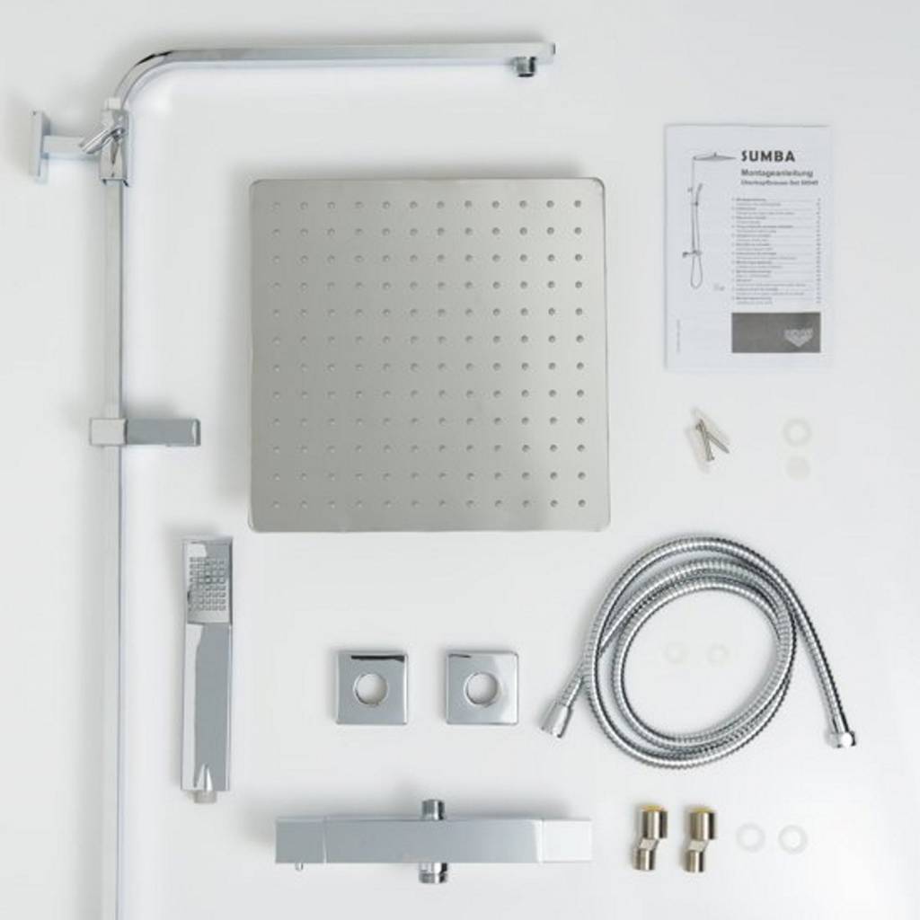 Deze regendouche opbouwset van het merk Schütte behoort tot de Sumba-serie en staat garant voor kwaliteit en design. De regendouche wordt geleverd met een thermostaatkraan waarmee u eenvoudig de temperatuur van het water in kunt stellen. Verder beschikt de set over een glijstang, een doucheslang, een regendouche en een handdouche. De glijstang is in hoogte verstelbaar met een minimum hoogte van 84 cm en een maximale hoogte van 118 cm. De vierkante hoofddouche heeft een lengte en breedte van 30 cm. Zowel de handals hoofddouche zijn voorzien van anti-kalk sproeigaatjes.