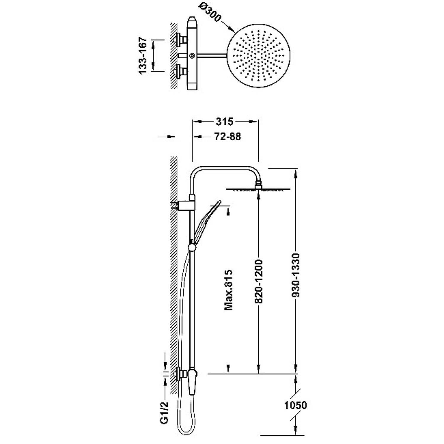 De afmetingen van deze Regendouche zijn: 187 tot 225 cm hoog en de douchekop heeft een diameter van 30 cm. De handdouche heeft een hoogte van 81.5 cm