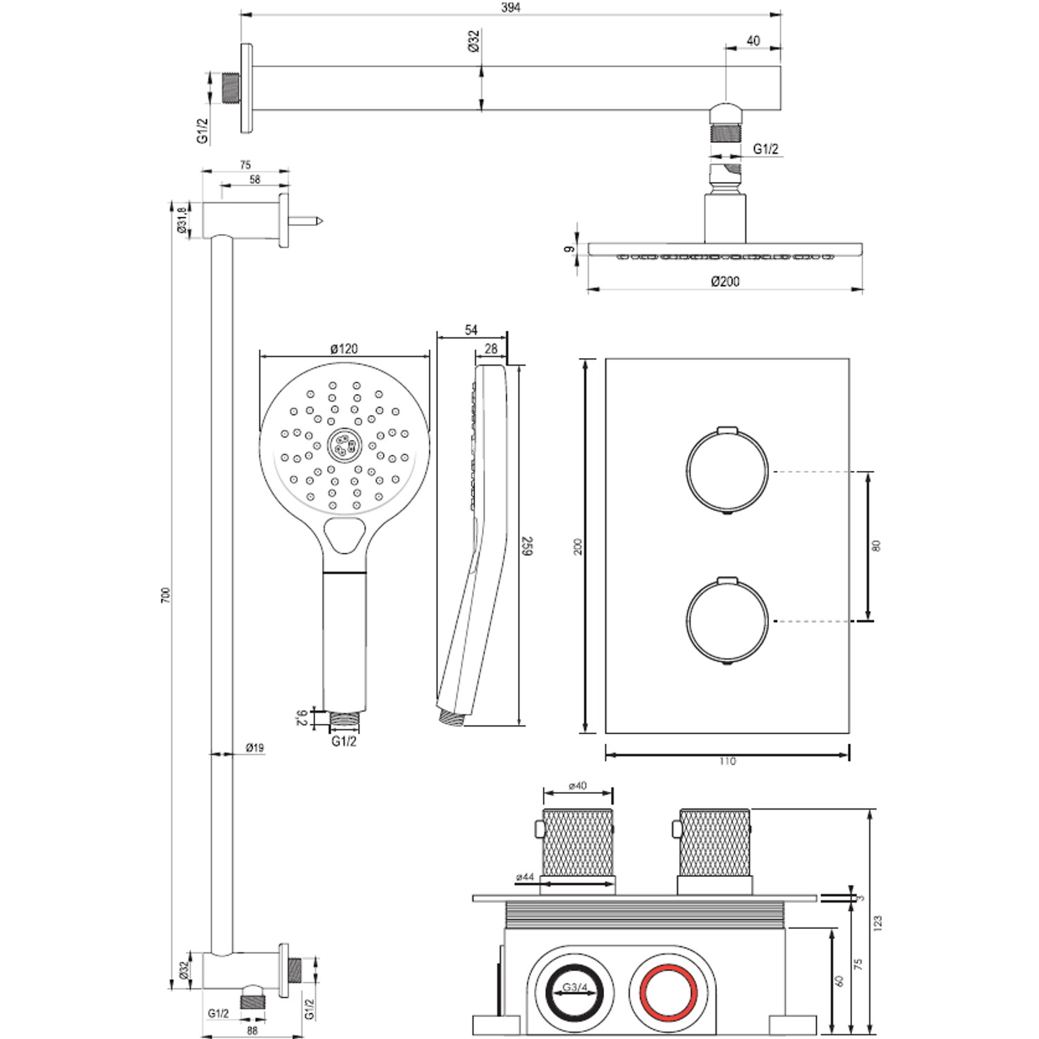 Wilt u graag wat luxe in uw badkamer halen? Dan is deze regendoucheset een zeer goede keuze. Deze regendoucheset bestaat uit een 3-weg thermostaat, handdouche staaf en regendouche van 20 cm. De inbouwthermostaat is gemakkelijk te bedienen. Met de onderste knop stelt u de gewenste watertemperatuur in. Met de bovenste knop bepaalt u de gewenste douchestand en switcht u tussen hoofd- en handdouche. De thermostaat is voorzien van een temperatuurblokkering bij 38°C. Zo is deze set ook voor kinderen veilig te gebruiken.