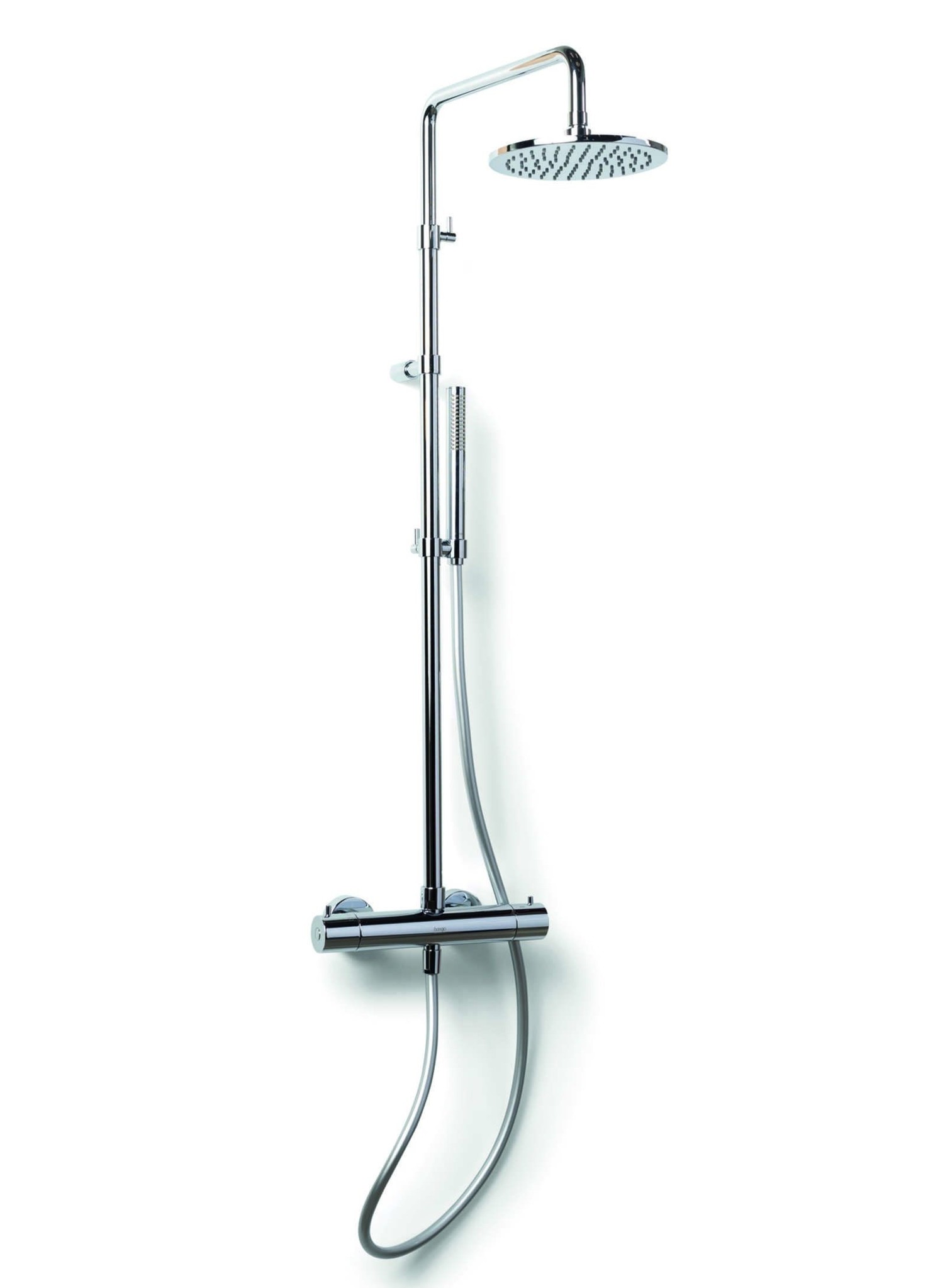 De hoofddouche is in hoogte verstelbaar tussen 73,4 cm en 111,9 cm. De maximale hoogte van de doucheset is 128 cm. De uitloop is 33,7 cm lang en 16,1 cm hoog. De diameter van de hoofddouche is 20 cm en de handdouche heeft een lengte van 18,5 cm. De thermostaatkraan heeft een lengte van 30,2 cm. U bedient de kraan met de twee draaiknoppen. De ene knopt gebruikt u om de kraan open en dicht te draaien. Met de andere knop bepaalt u de gewenste temperatuur.