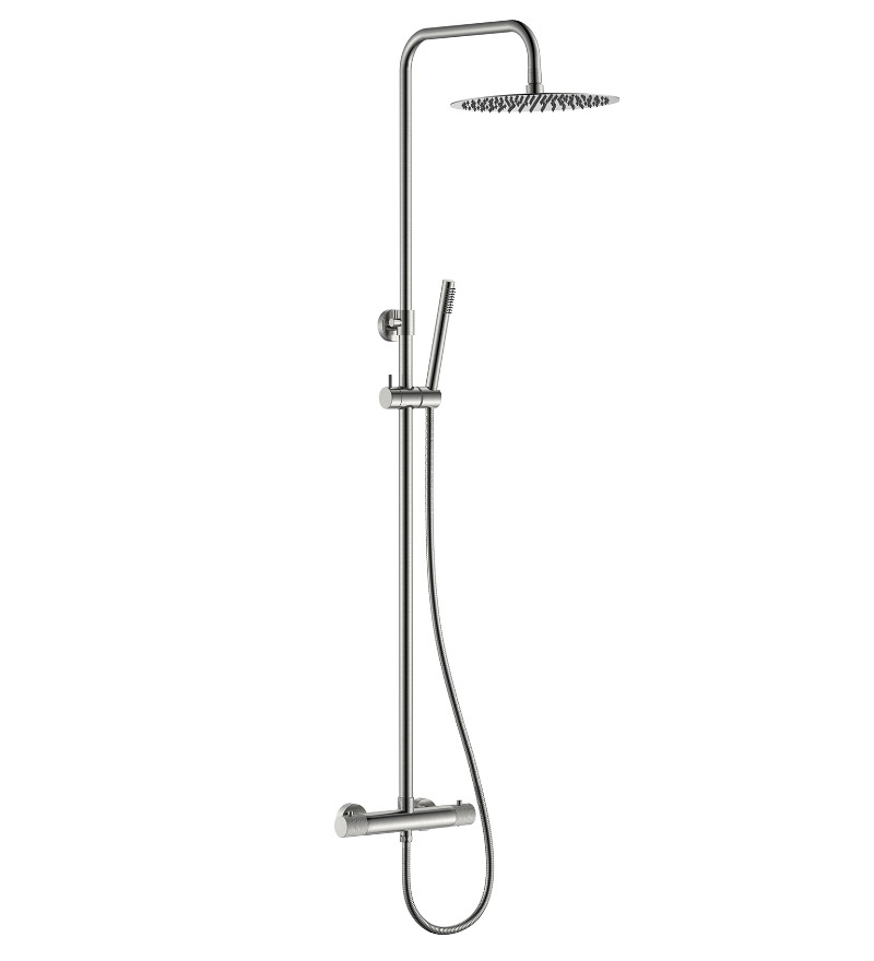 Deze Opbouw Regendoucheset is van het merk Wiesbaden en komt uit de serie Ribbd. De fraaie regendoucheset is van messing en de kleur is geborsteld staal. Hij is in hoogte verstelbaar en de set bestaat uit een regendouche en een handdouche. De afmeting van de hoofddouche is 25 cm. De fabrieksgarantie voor de set bedraagt 2 jaar.