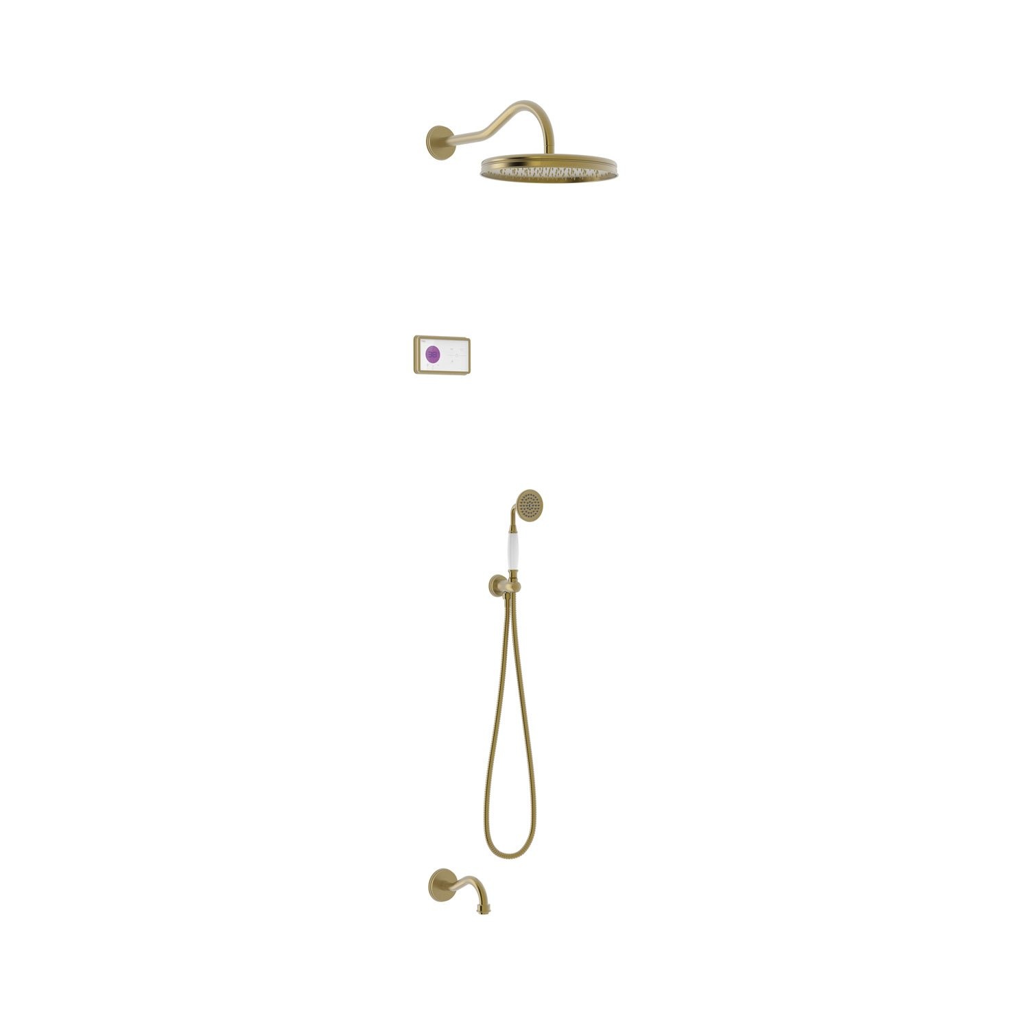Deze regendoucheset van Tres komt uit de Clasic serie. Deze serie bestaat uit allemaal artikelen met een klassieke uitstraling. Dit is inbouwdouche is gemaakt van messing in een Verouderd Messing Mat kleur. De hoofddouche heeft een diameter 31 cm en de antikalk handdouche heeft een diameter van 7.8 cm. De inbouw thermostatische kraan is elektronisch en voorzien van vochtafdichtingen van Schlüter in een witte kleur. Door het keramische binnenwerk behoud deze kraan jarenlang zijn kwaliteit. De lengte van de geribbelde doucheslang is 170 cm. De hoofddouche heeft een uitloop uit de muur. Deze regendoucheset is inclusief baduitloop.