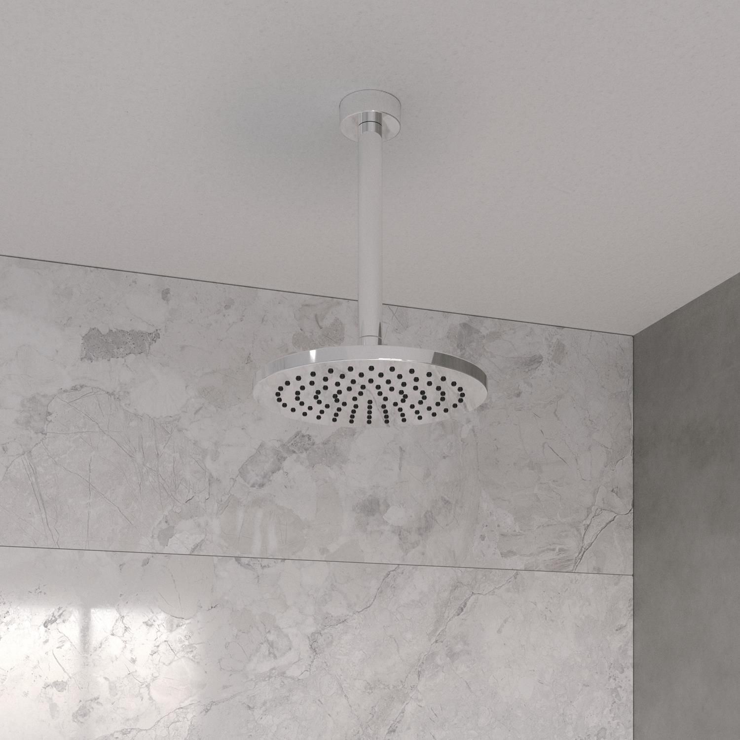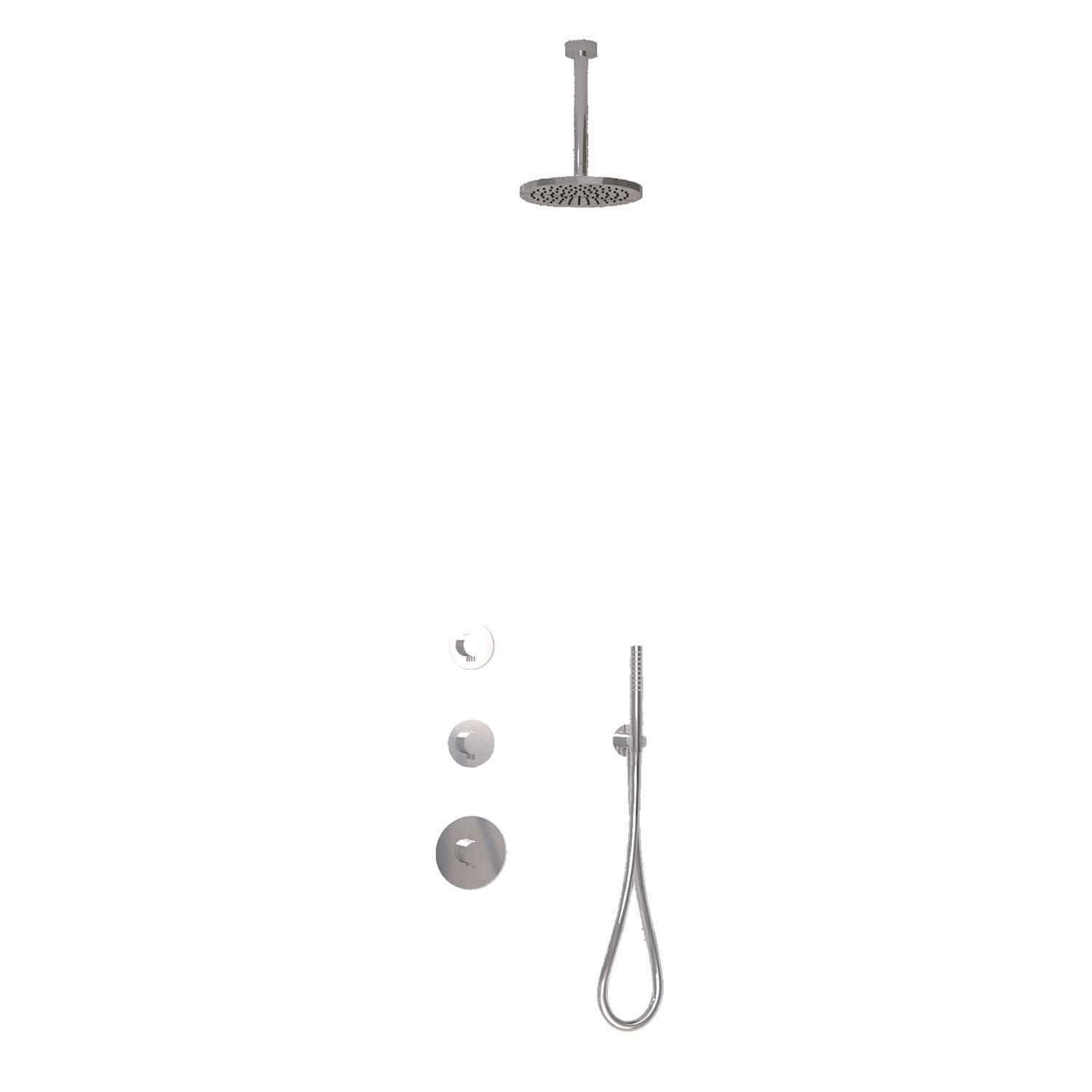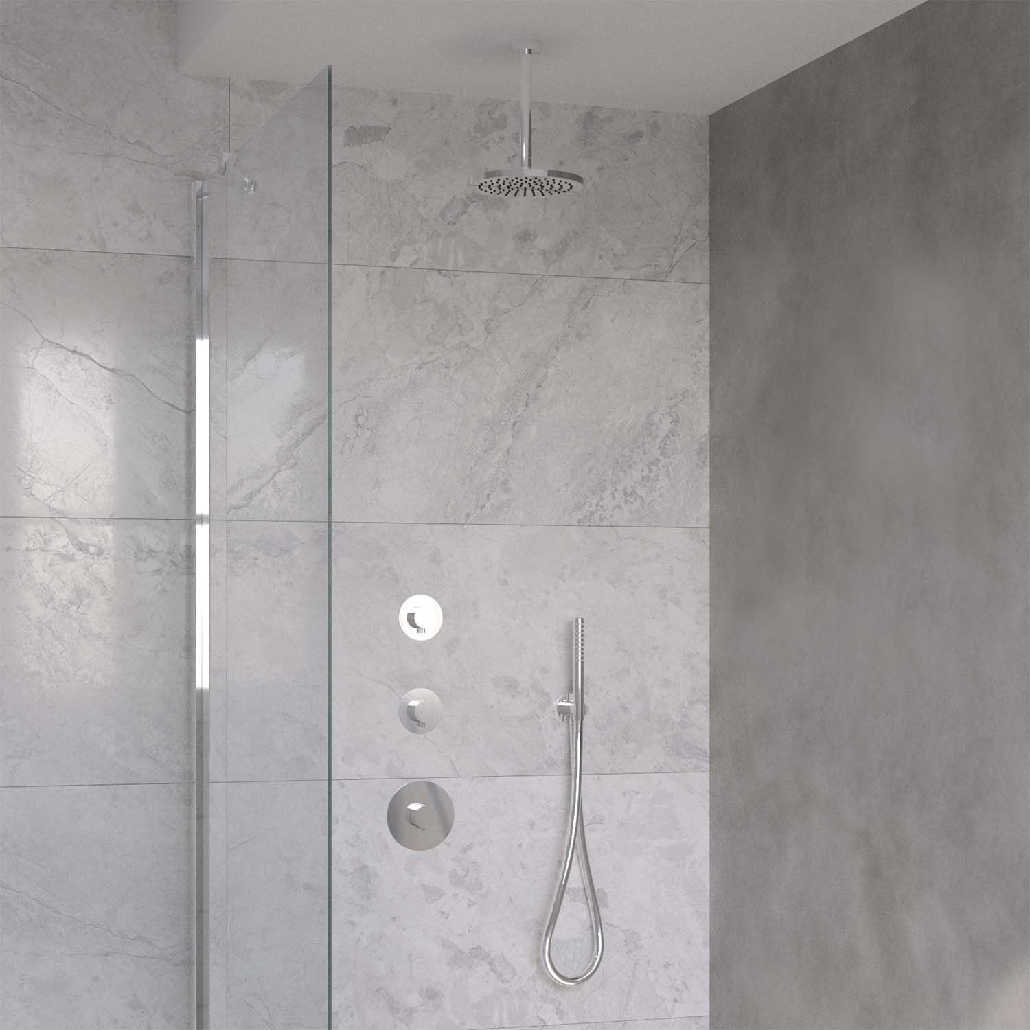De set wordt geleverd met thermostatische douchekraan, 2 stopkranen, een regendouchekop met bijpassende plafonduitloop, muuruitlaat, doucheslang en handdouche. Daarnaast heeft u de optie een alternatieve douchekop, handdouche, plafonduitloop en wanduitlaat te kiezen, eventueel voor een meerprijs.