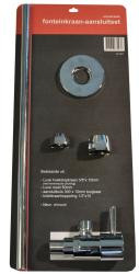 Universele toiletkraan-aansluitset in blister chroom, Inhoud:, - Hoekstopkraantje 3/8"buiten met keramische afdichting en rozet, - Buigbare verchroomd buisje van 30cm x 10mm, - koppeling 1/2" x 10mm voor de toiletkraan aansluiting,