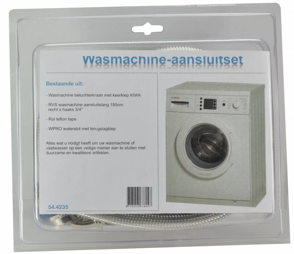Wasmachine aansluitset bestaande uit: - RVS wasmachine slang 150cm rexha - Kiwa beluchterkraan met keerklep - Waterslot - Rol teflon tape Verpakt in blister.