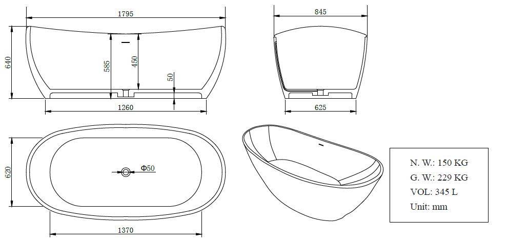 Solid Surface vrijstaand bad , type 1, Dit bad kan vrijstaand in de badkamer geplaatst worden, Maat: 1795x845x640, Mat-wit, Voorzien van clickwaste en badsifon, met flexibele afvoerslang, , LET OP: er dient een uitsparing in de vloer gemaakt te worden ter