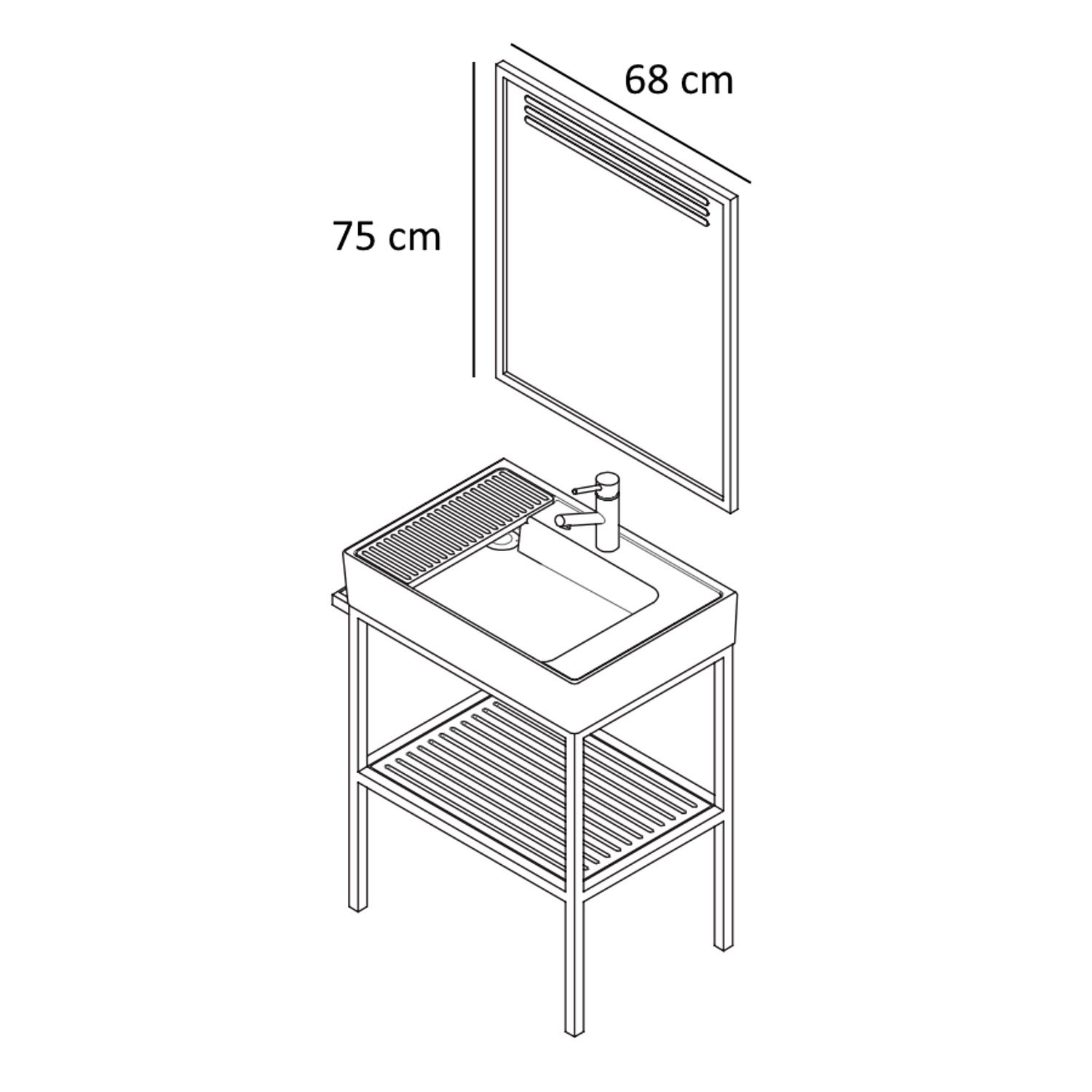 De spiegel is 75 cm hoog en 68 cm breed en uitgevoerd met een mat zwarte frame.
