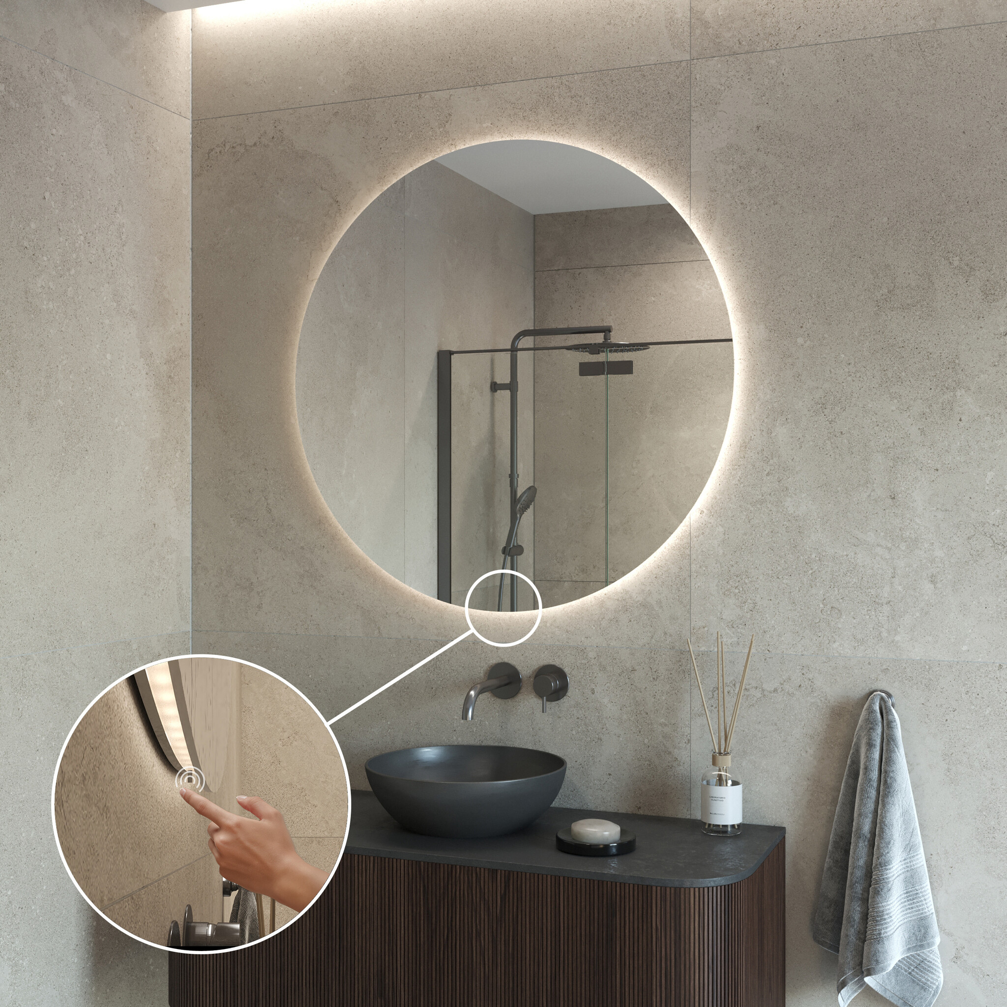 Verder bevat de spiegel een knop waarmee u de verlichting eenvoudig kunt bedienen. Er wordt een mat bijgeleverd voor de verwarming van de spiegel. Wanneer de verlichting is uitgeschakeld, licht de button blauw op.