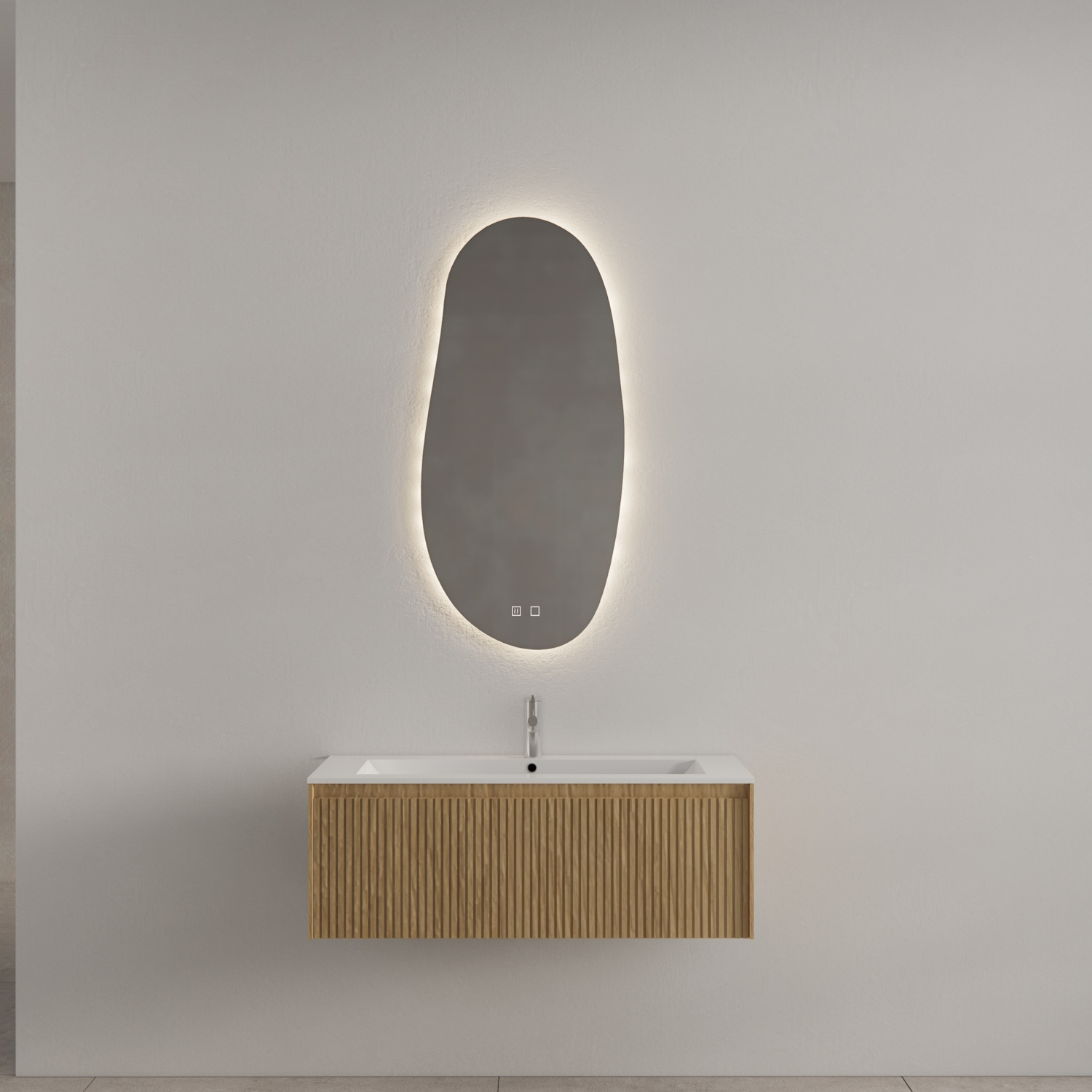 Geef uw badkamer een unieke eyecatcher met de Maya spiegel van Gliss Design. De spiegel heeft een organische ovale vorm die goed tot zijn recht komt in een moderne badkamer. De achterkant van de spiegel geeft een mooie sfeerverlichting. Deze geeft extra licht in uw badkamer en zorgt voor goed zicht in uw spiegel. U kunt zelf de temperatuur van de led-verlichting aanpassen. Daarnaast bevat de spiegel spiegelverwarming. Hierdoor zal geen condens op uw spiegel ontstaan, bijvoorbeeld na het douchen. Ideaal voor in de badkamer dus! Zo kunt u altijd met plezier van uw spiegel gebruik maken. U bedient de verwarming en verlichting eenvoudig met de touchknoppen op de spiegel.