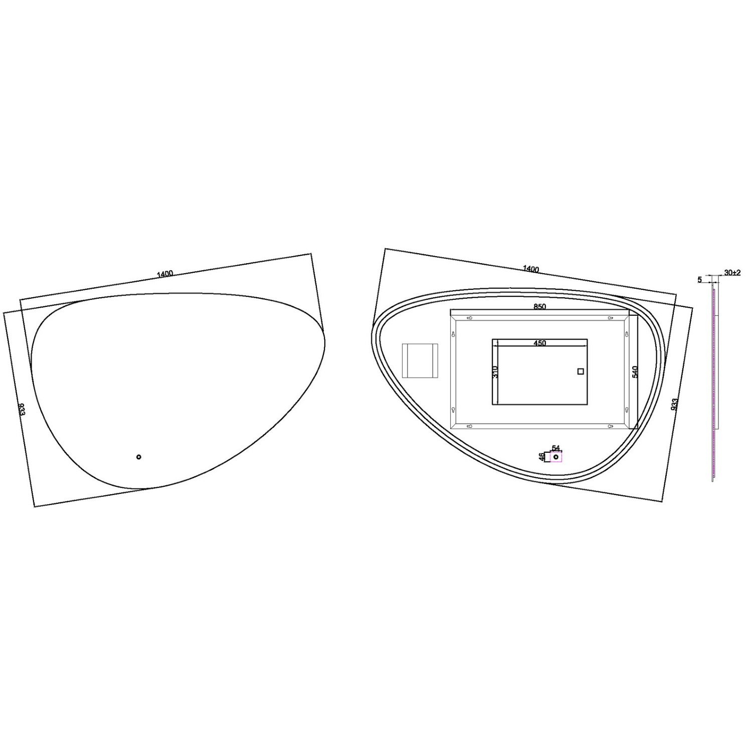 De badkamerspiegel heeft een unieke organische vorm en heeft een breedte van 140 cm.