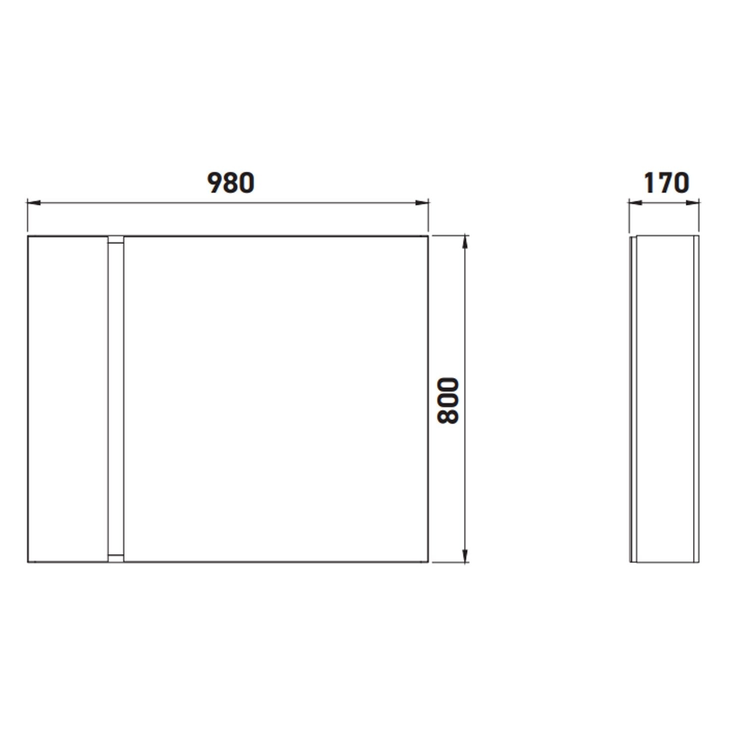 De spiegelkast is 98 cm breed, 80 cm hoog en 17 cm diep.