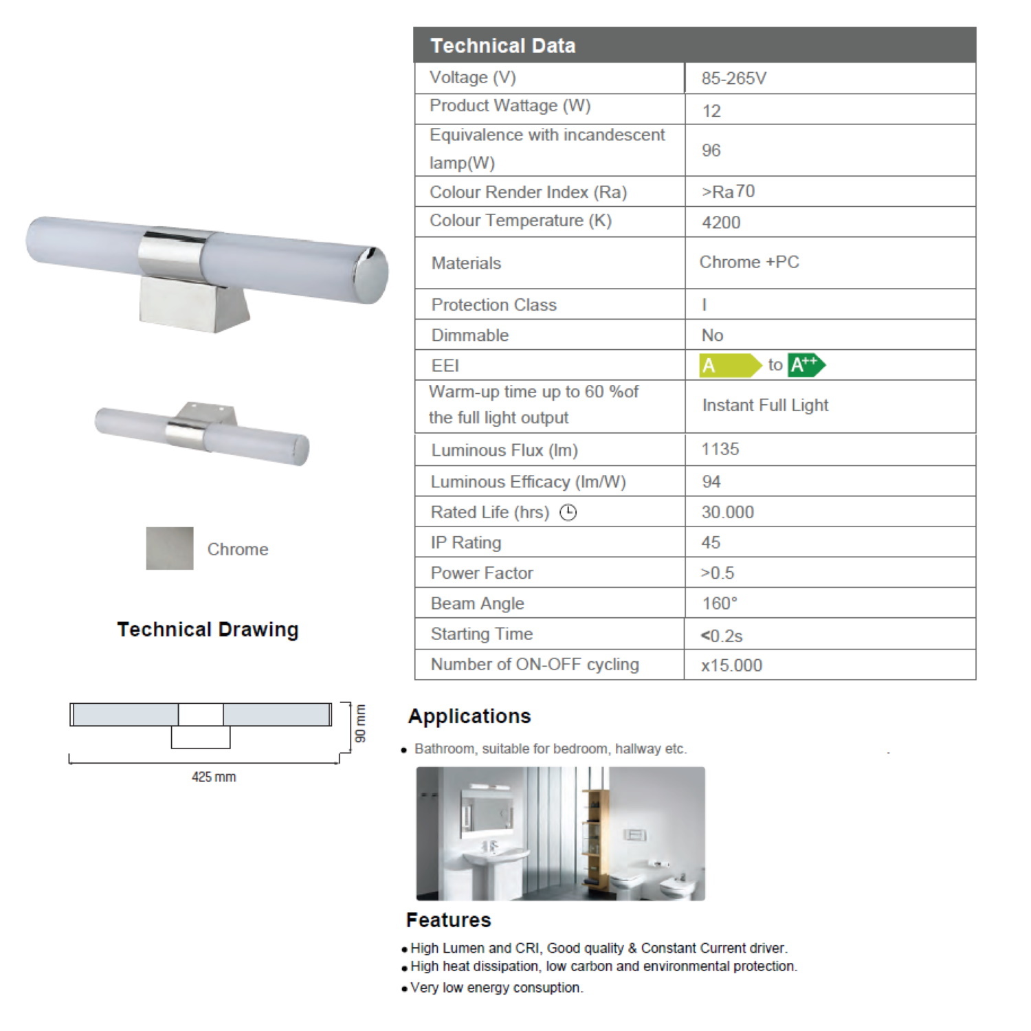 Op zoek naar extra verlichting voor in uw badkamerruimte? Kies dan voor de Aloni verlichting van het merk Boss & Wessing! Deze spiegelverlichting kunt u uitstekend combineren met een badkamerspiegel of spiegelkast. De LED-verlichting heeft een kleurtemperatuur van 4200 Kelvin (koud wit). Het totale vermogen van deze spiegelverlichting bedraagt 12 Watt. De verlichting is uitgerust zonder een schakelaar. Bovendien is dit type verlichting ook leverbaar met een schakelaar.