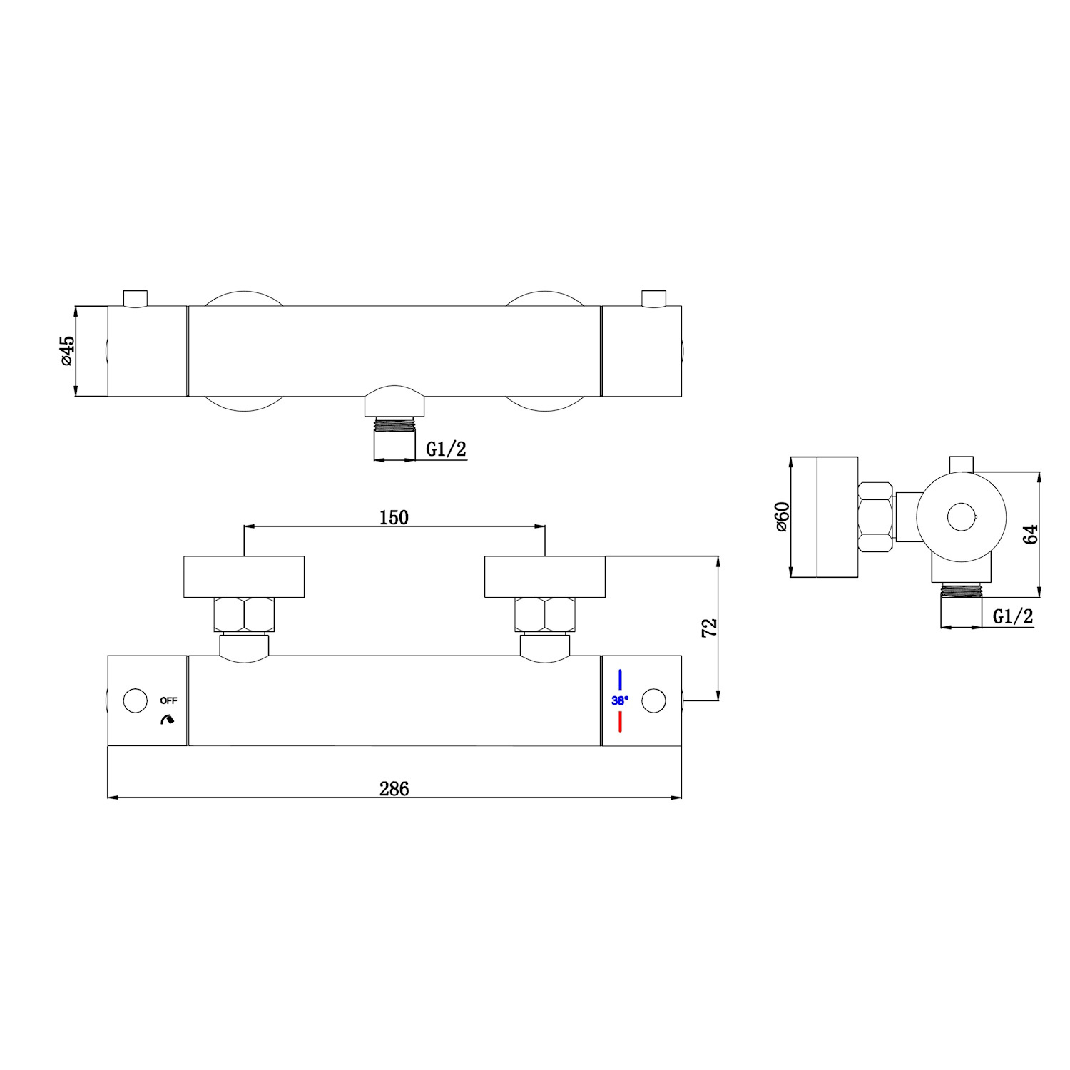 De kraan heeft aansluitingen met een aansluitmaat van 1/2" met ronde 2 ronde knoppen voor het aan en uit zetten van de kraan en het bepalen van de temperatuur. Hij heeft een Hoh afstand van 15 cm, hierop worden de harten van de kraan aangesloten. Het binnenwerk van deze kraan is voorzien van keramische schijven en hij is ook voorzien van een temperatuurbegrenzer. Bij het bestellen van deze kraan worden er voor de nette afwerking ook S koppelingen en rozetten meegeleverd.
