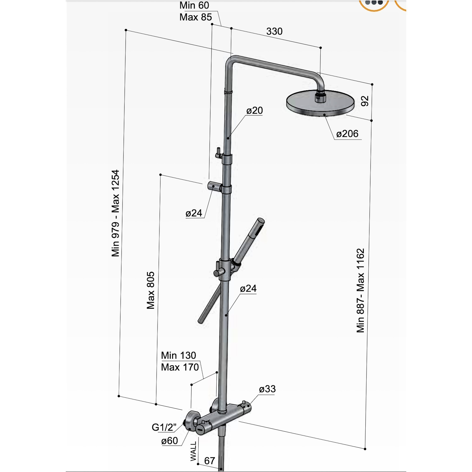 De set bestaat uit een thermostaatkraan, een staafhanddouche met doucheslang, een ronde hoofddouche met een diameter van 20 cm en een glijstang. Een complete regendouche in één dus!