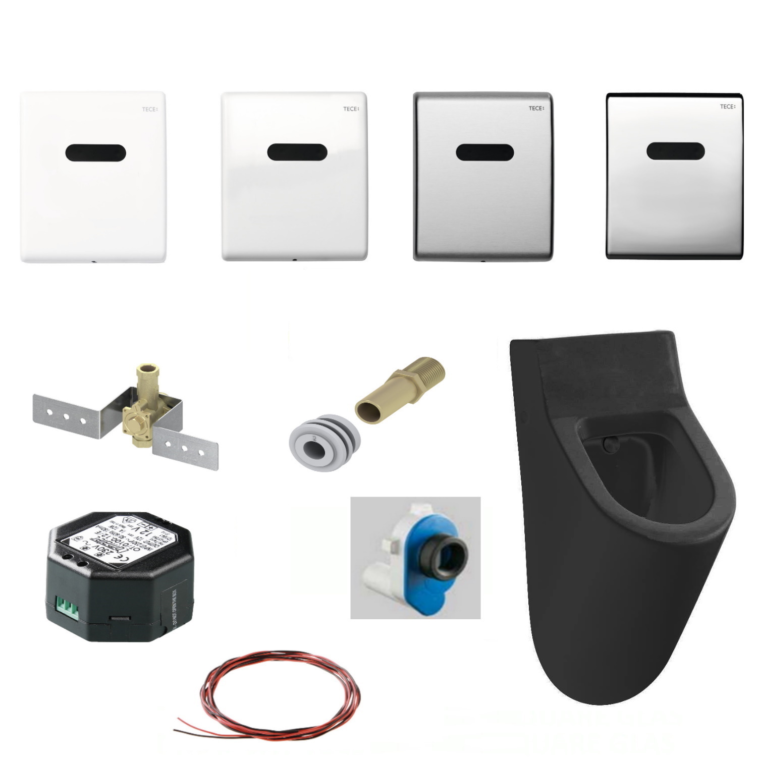 Naast de standaard drukspoelerbehuizing, inlaatgarnituur en het sifon heeft u bij deze urinoir set ook de keuze uit vier verschillende elektronische drukplaten van het merk TECE. Deze drukplaten zijn voorzien van een infraroodsensor en werkt op basis van een adaptor. De drukplaat heeft een breedte van 10 cm, een hoogte van 12 cm en een diepte van 1,2 cm. U heeft bij de drukplaten de keuze uit een mat witte, glanzend witte, RVS geborstelde of glanzend chromen drukplaat.