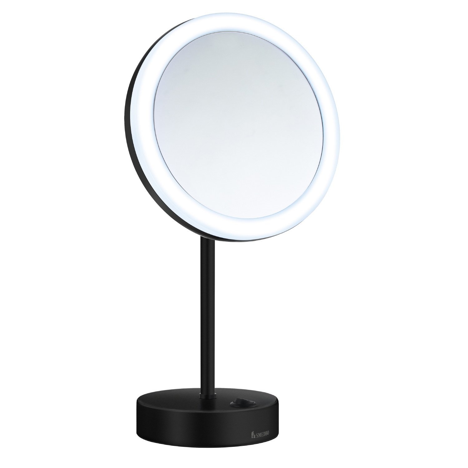Professionele make-up spiegel van Smedbo Outine. Vrijstaand model met Dual light. Spiegel heeft twee kanten, een kant die 5x vergrotend is en een kant zonder vergroting. Keuze tussen warm en koud licht. Spiegel werkt met 4x AA batterijen, deze zijn niet inbegrepen. Spiegel heeft een diameter van 20cm en een hoogte van 38 cm. Minimale warmteontwikkeling met niet verblindend licht. De spiegel is 5x vergrotend. Voor een stijlvolle uitstraling heeft de spiegel als kleur mat zwart.