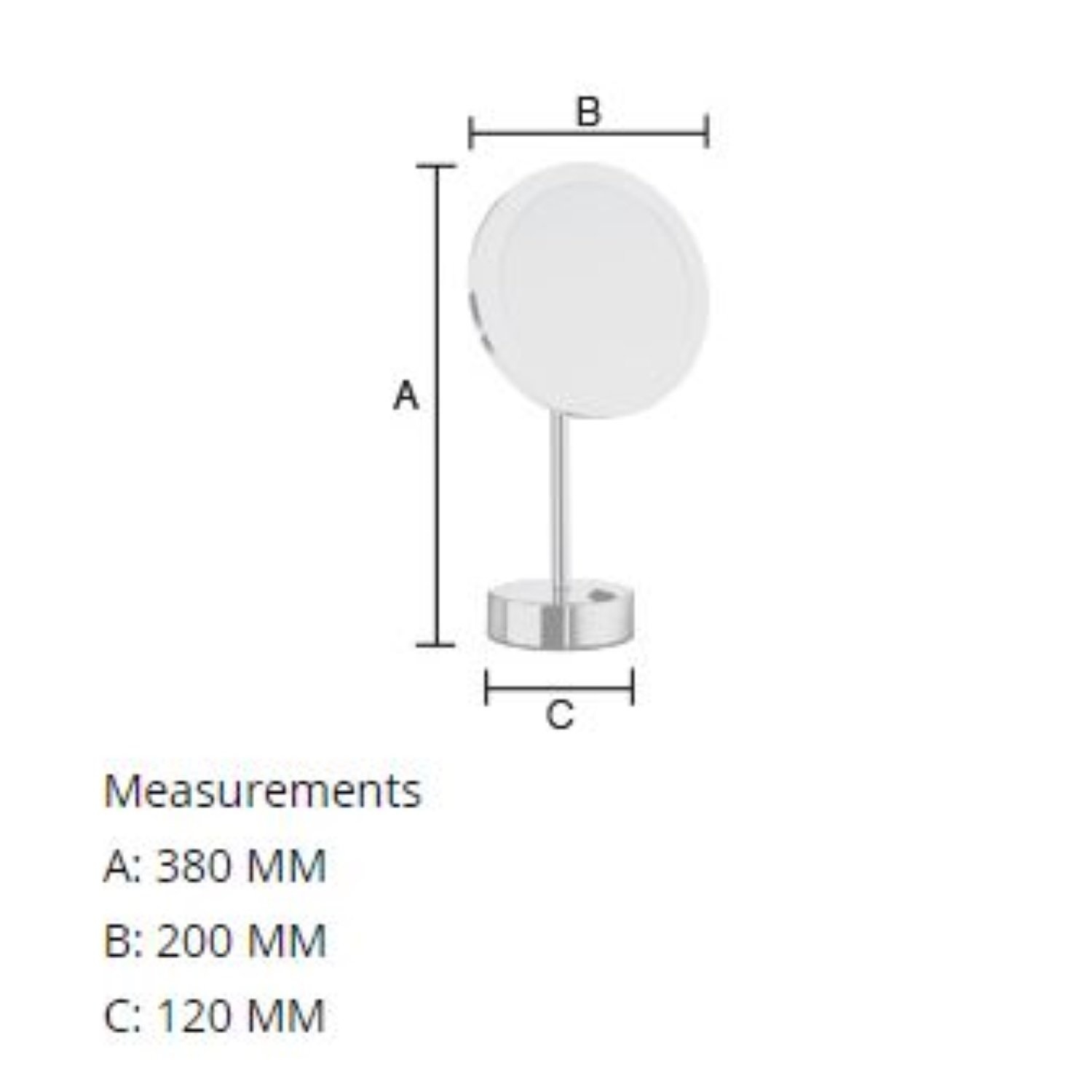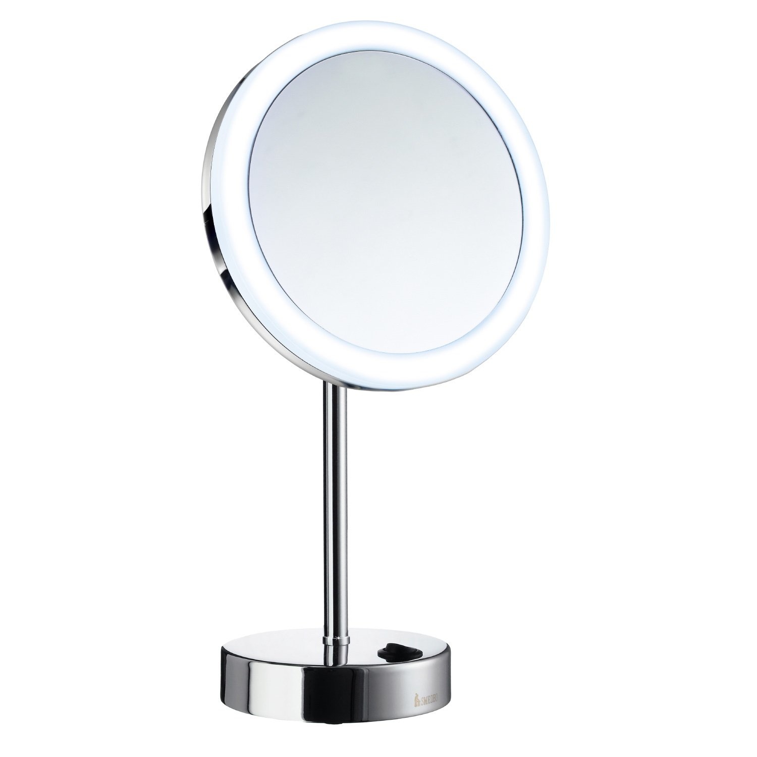 Professionele make-up spiegel van Smedbo Outine. Vrijstaand model met Dual light. Spiegel heeft twee kanten, een kant die 5x vergrotend is en een kant zonder vergroting. Keuze tussen warm en koud licht. Spiegel werkt met 4x AA batterijen, deze zijn niet inbegrepen. Spiegel heeft een diameter van 20cm en een hoogte van 38cm. Minimale warmteontwikkeling met niet verblindend licht. De spiegel is 5x vergrotend. Voor een stijlvolle uitstraling heeft de spiegel als kleur chroom.