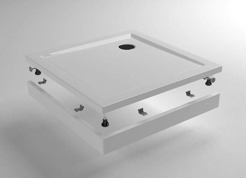Voorzet paneel met poten voor de douchebak. Dit is voor de vierkante douchebak acryl 90x90x4 Wit (artikelnummer 21.3501). Het voorzet paneel zorgt ervoor dat de douchebak aan de voorkant voorzien wordt van speciale panelen voor de afwerking van uw douchebak.