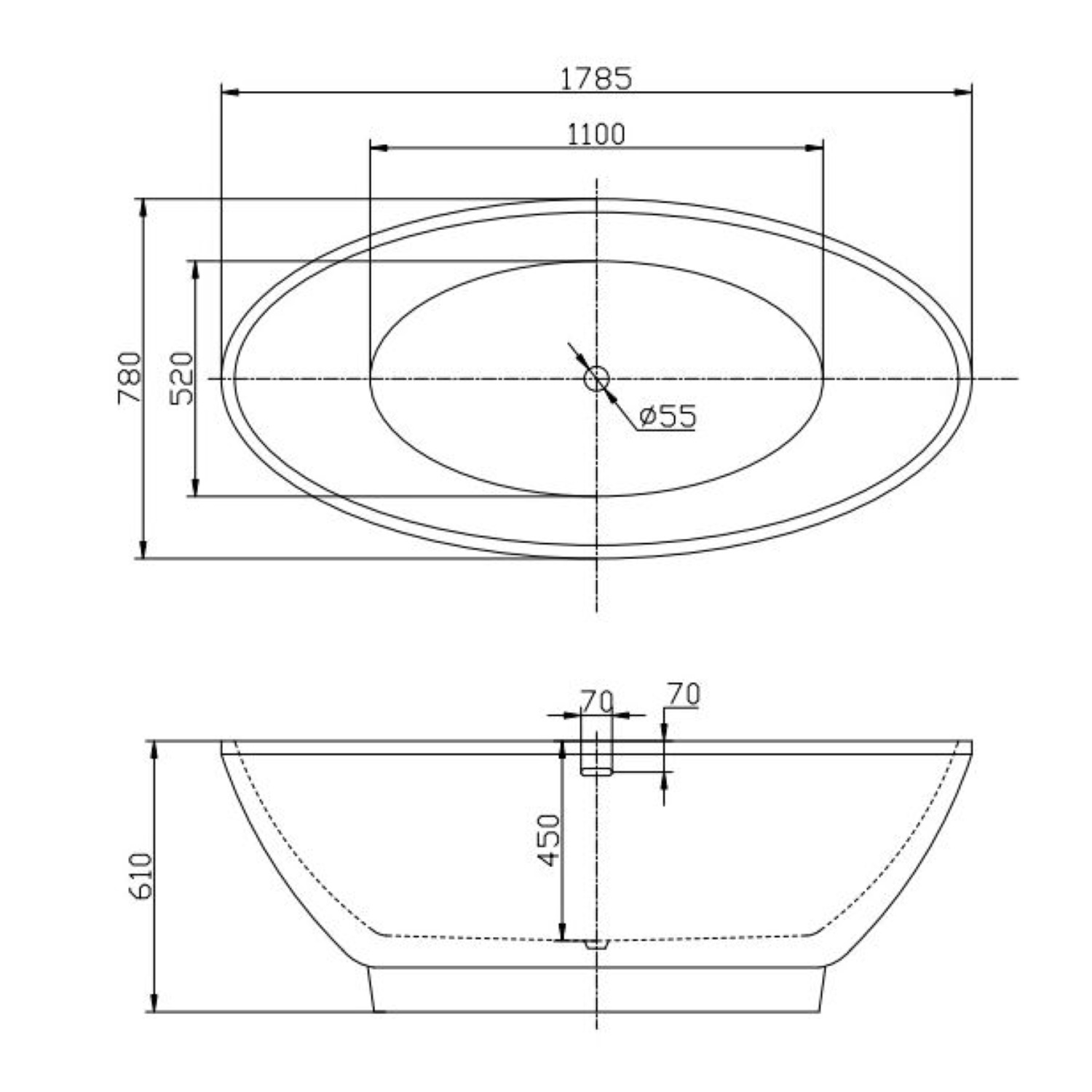 In het bad zit een overloop met een chromen click-waste en wordt geleverd inclusief sifon.