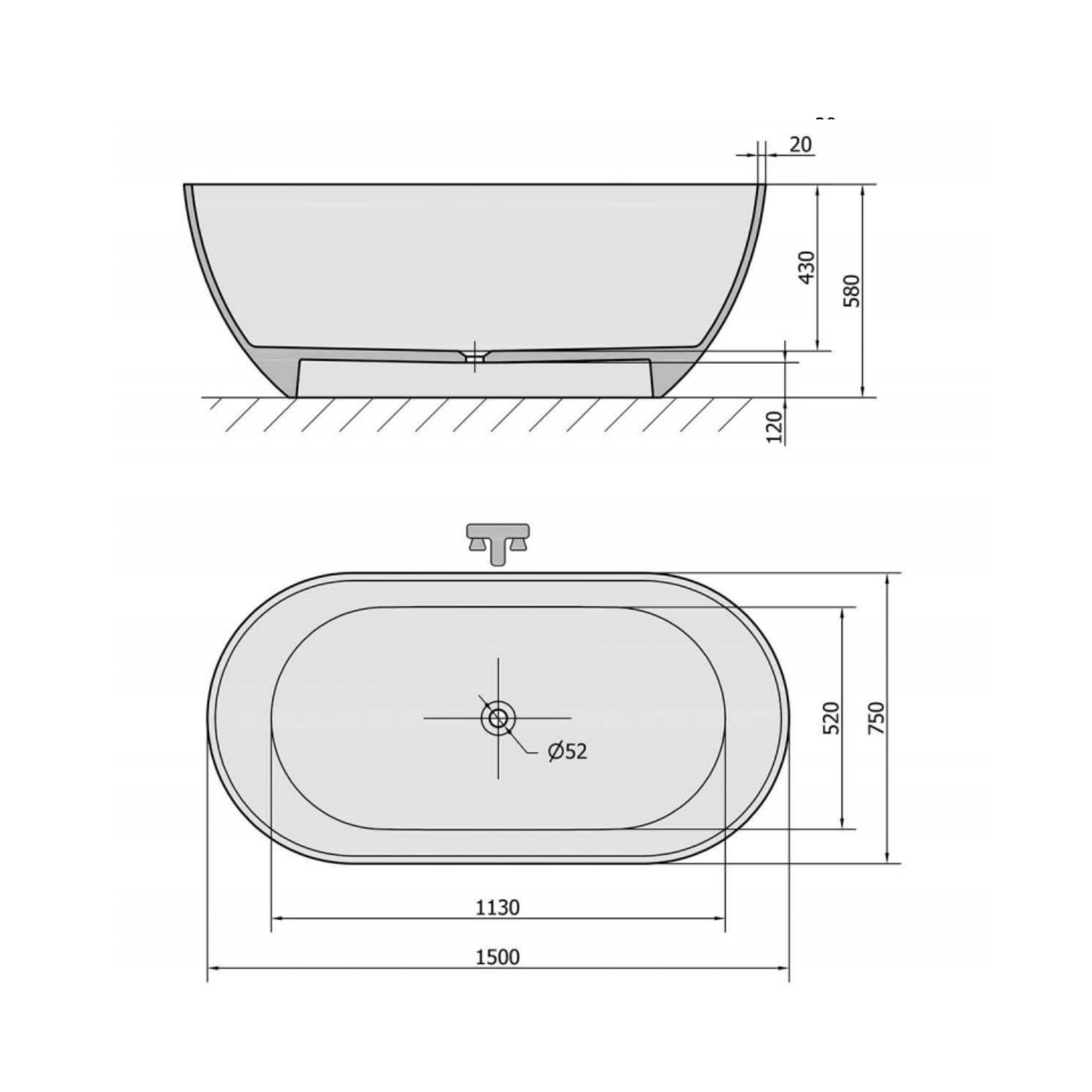 Het bad is 150 cm lang en 75 cm diep en heeft een hoogte van 58 cm, genoeg om er relaxt in te zitten. De afvoer zal niet in de weg zitten want die zit netjes in het midden.