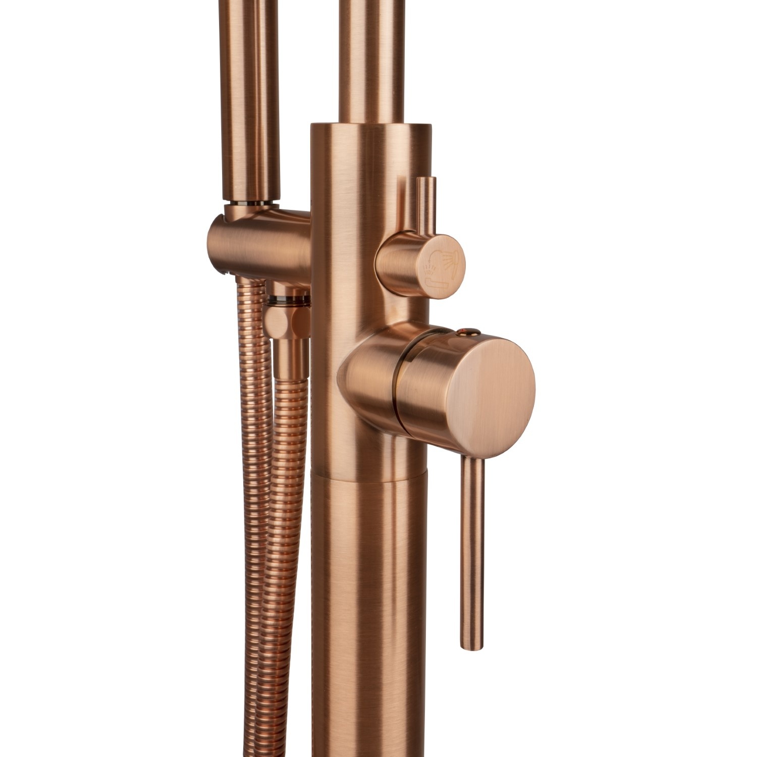 Met de 'Colorato' vrijstaande badkraan van het merk Aqua Splash haalt u een bijzondere kraan in huis. De kraan is gemaakt van messing en heeft een afwerking in de kleur geborsteld koper. De vrijstaande badkraan is uitgerust met een handdoucheset die bestaat uit een doucheslang en een staaf handdouche. De vrijstaande badkraan kan uitstekend gecombineerd worden met een (vrijstaand) ligbad.