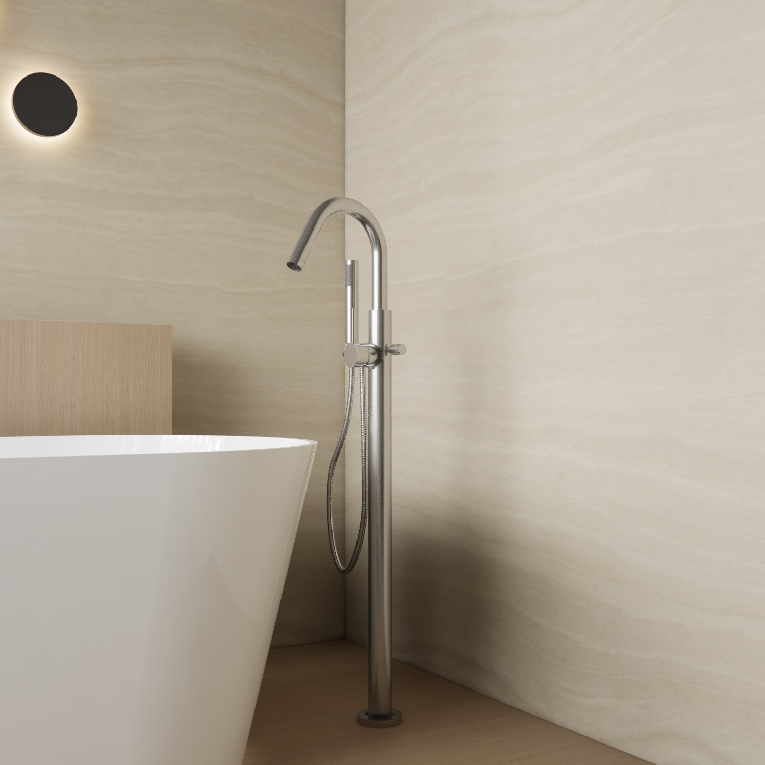 Deze vrijstaande badkraan staat garant voor kwaliteit en design. Het betreft een complete set bestaande uit een badkraan, een handdouche en een doucheslang. Alle elementen van deze set zijn afgewerkt in de kleur glanzend chroom, wat een luxe uitstraling aan uw badkamer geeft.