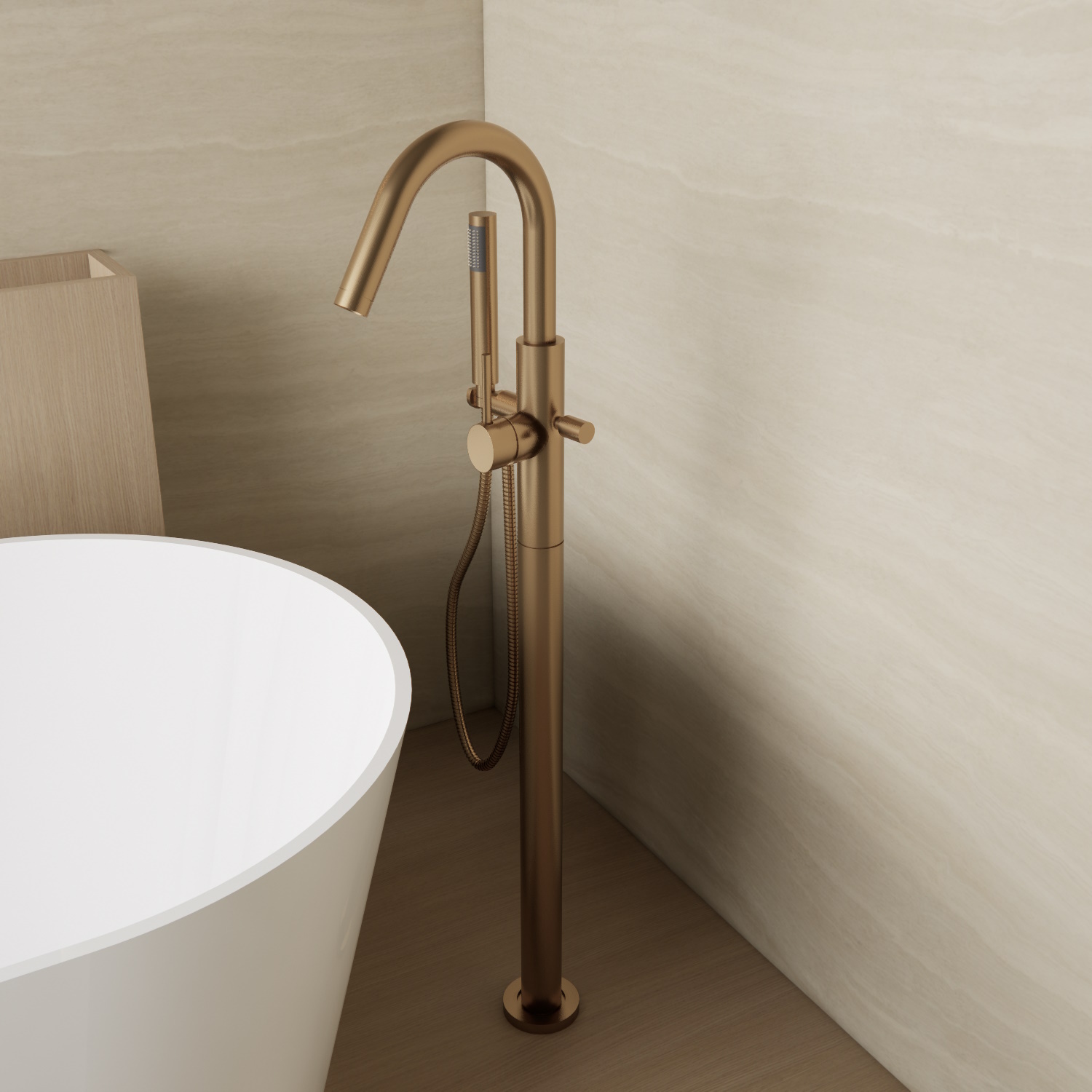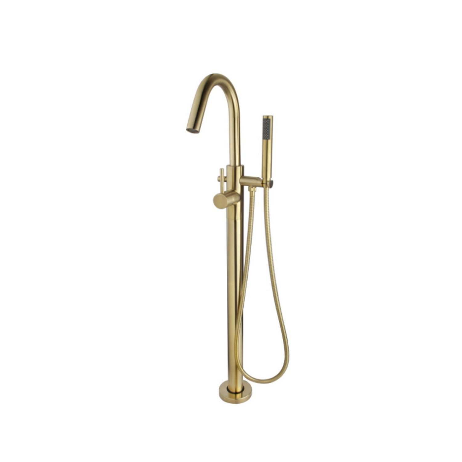 Deze vrijstaande badmengkraan staat garant voor kwaliteit en design. Het betreft een complete set bestaande uit een badkraan, een handdouche en een doucheslang. Alle elementen van deze set zijn afgewerkt in de kleur geborsteld messing, wat een luxe uitstraling aan uw badkamer geeft.