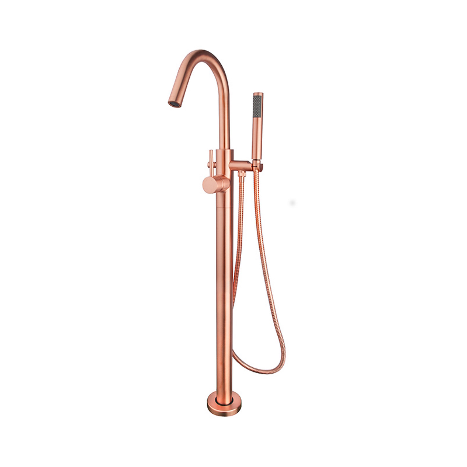 Deze vrijstaande badmengkraan staat garant voor kwaliteit en design. Het betreft een complete set bestaande uit een badkraan, een handdouche en een doucheslang. Alle elementen van deze set zijn afgewerkt in de kleur geborsteld koper, wat een luxe uitstraling aan uw badkamer geeft.