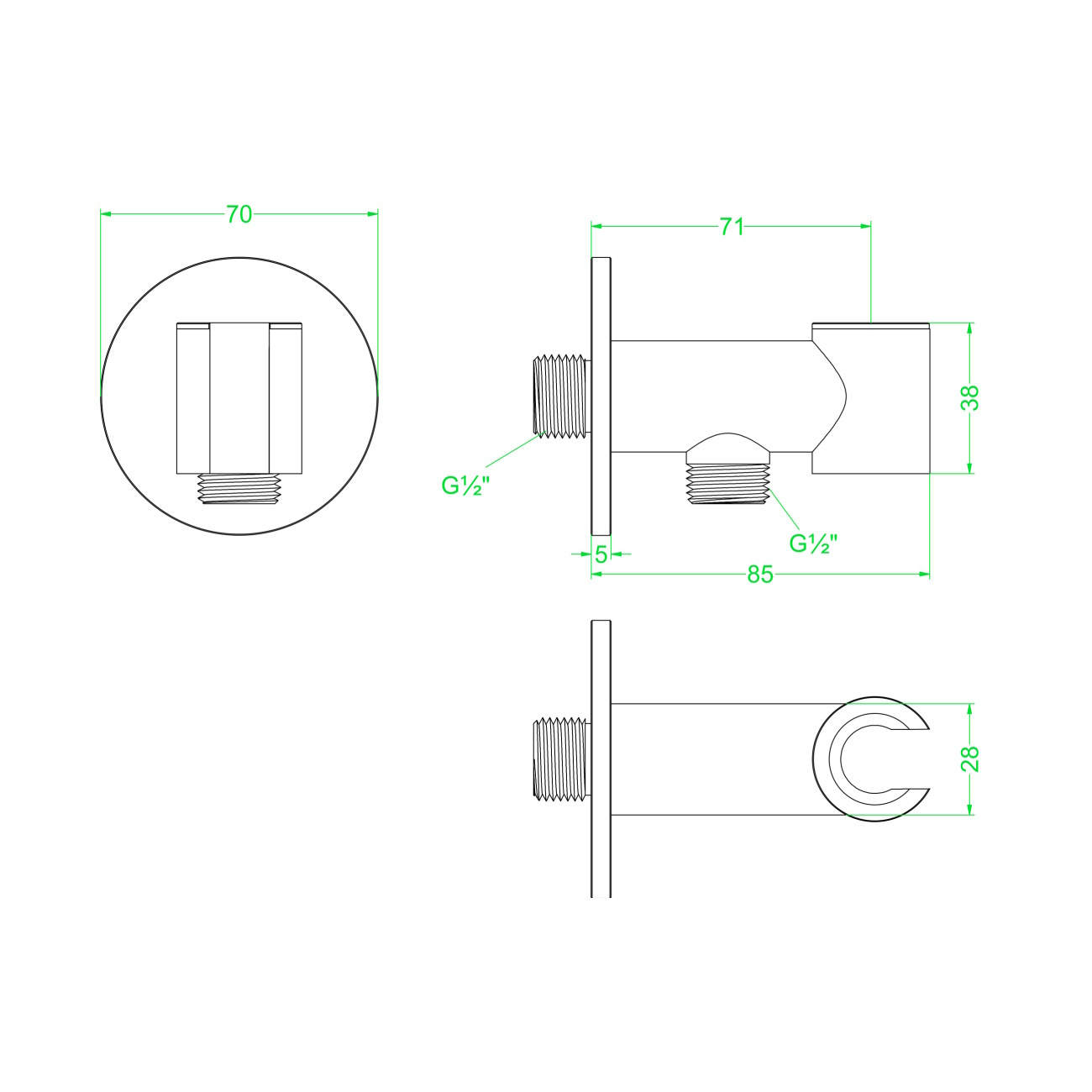 De houder heeft een Lengte van 8,5 cm cm en een breedte van 2,8 cm. De hoogte van de wandsteun is 3,8 cm en heeft een draadaansluiting van 1/2 inch.