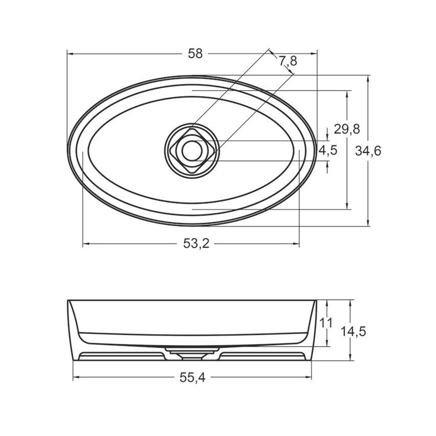 De waskom heeft een breedte van 58 cm en een diepte van 34.6 cm. De kom is 14.5 cm hoog. Het diameter van de afvoer is 4,5 cm in doorsnee.