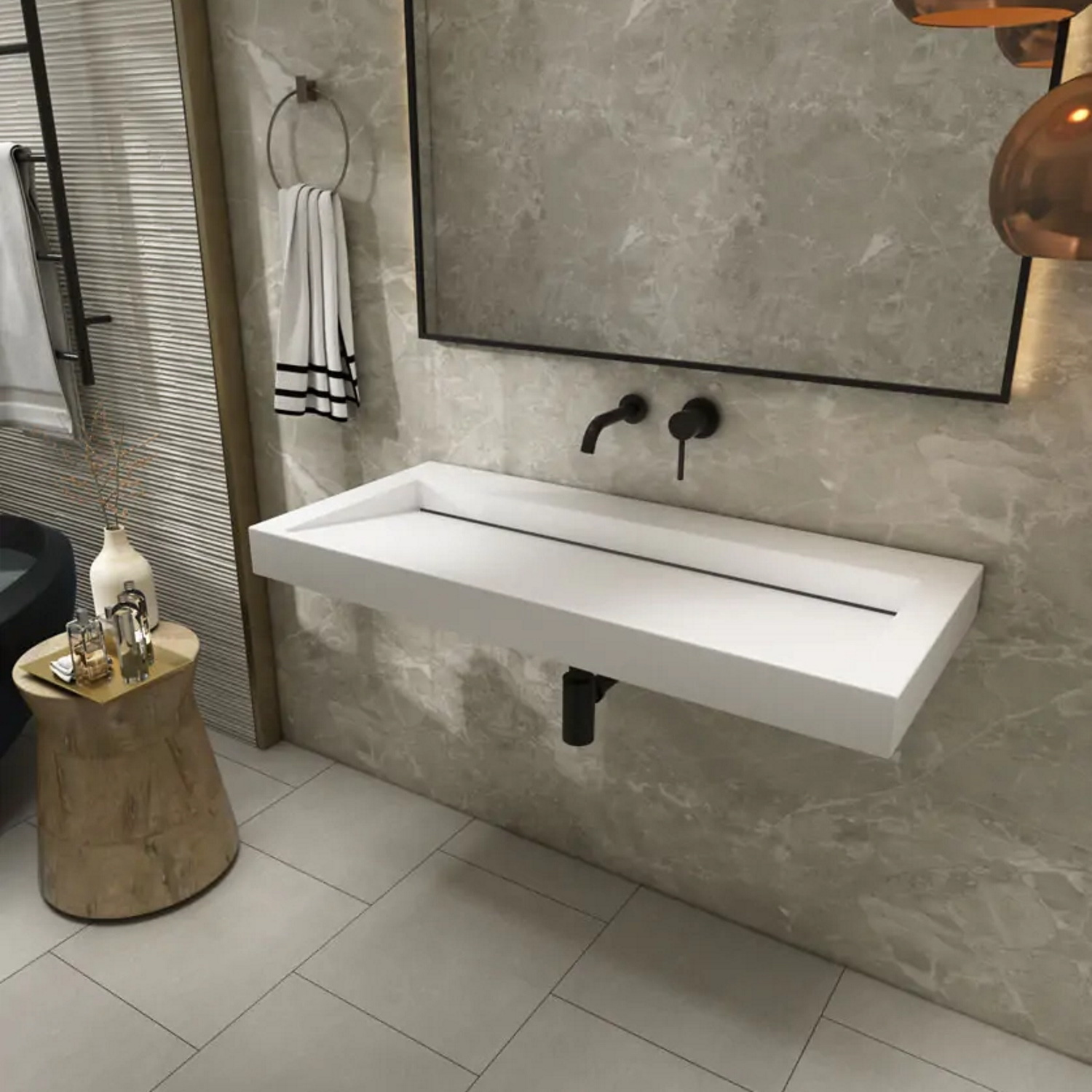 Deze strakke, moderne wastafel komt uit de Hoya collectie van AquaSplash. U kunt deze wastafel op een meubel plaatsen of ophangen aan de wand. Dit model heeft geen kraangaten. Dankzij de schuine afloop voert het water zichzelf af door de design gleuf in de wastafel. Het is dus niet mogelijk om het water in de wastafel af te sluiten. Daarnaast heeft u ook geen clickwaste nodig. De wastafel is gemaakt van Solid Surface. Dit materiaal wordt dankzij de goede eigenschappen steeds vaker in badkamers gebuikt. Zo bevat het geen poriën waardoor het zeer hygiënisch en slijtvast is. Het materiaal is vlekwerend en vochtbestendig en zeer eenvoudig schoon te maken.