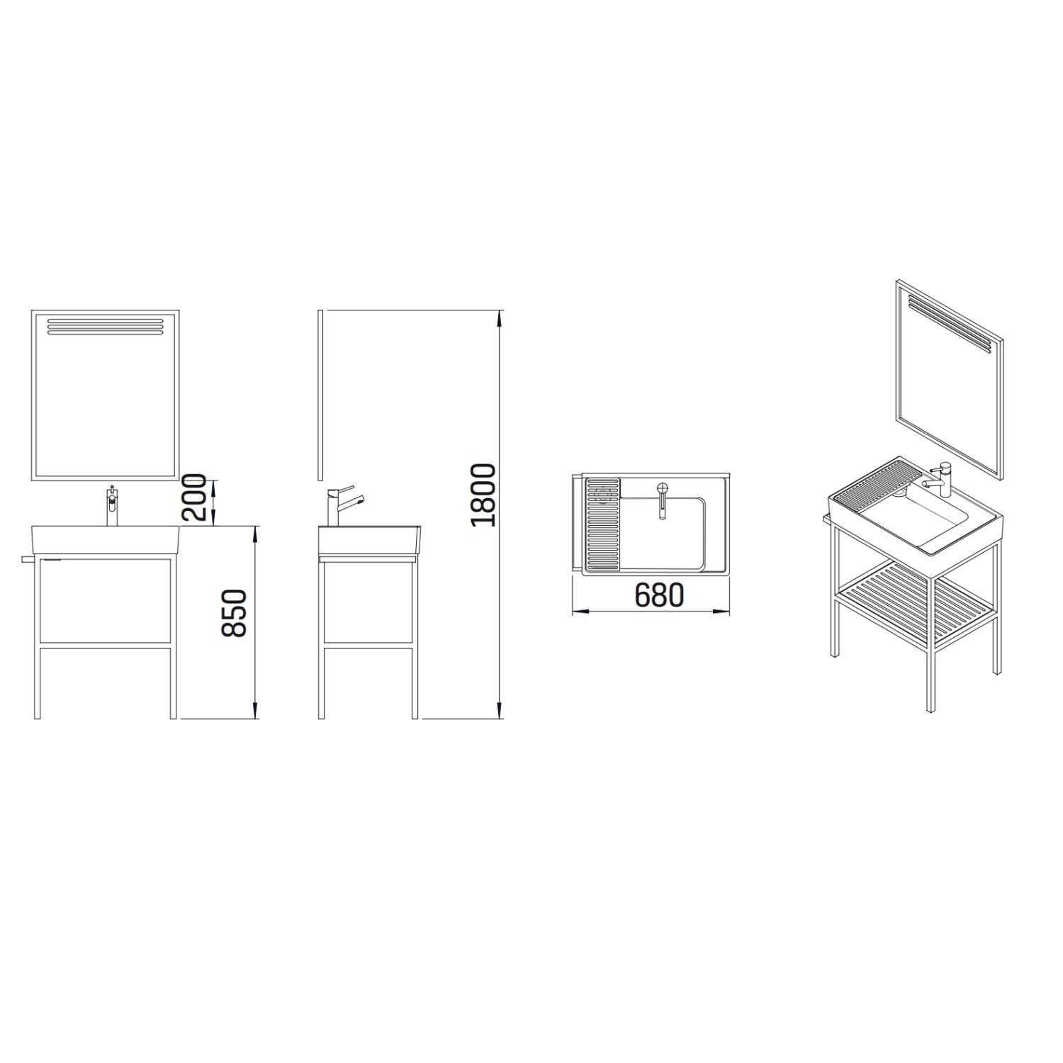 De wastafel is samen met de bijpassende onderkast 85 cm hoog en 68 cm breed en uitgevoerd met een mat zwarte legger. Wastafelkraan niet inbegrepen.