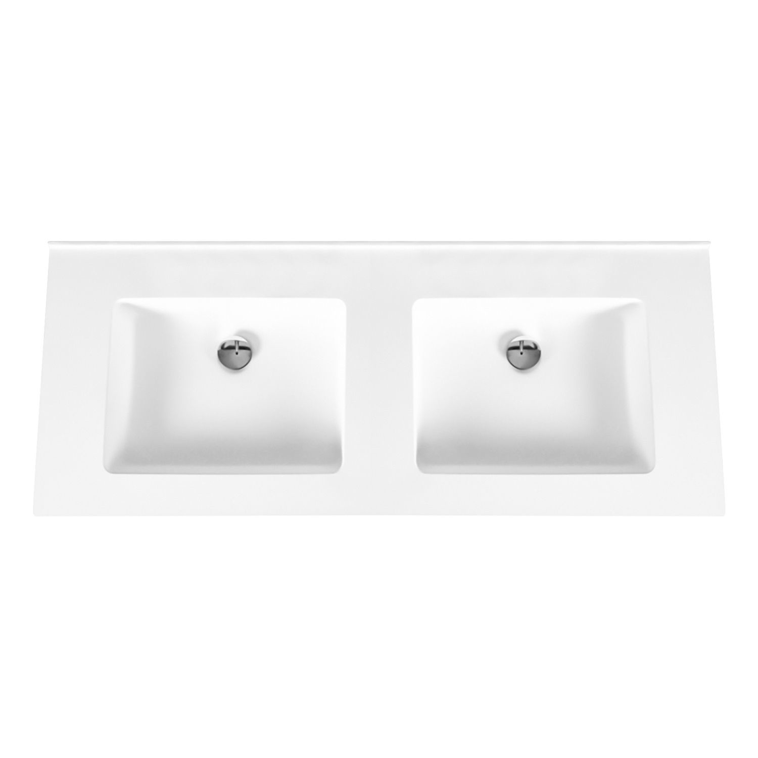 Deze wastafel is geproduceerd in de kleur wit en heeft een rechthoekige vorm. De diepte van deze wastafel bedraagt 45.5 cm cm en de breedte 154 cm. In het midden van dit artikel bevinden zich twee rechthoekige wasbakken.