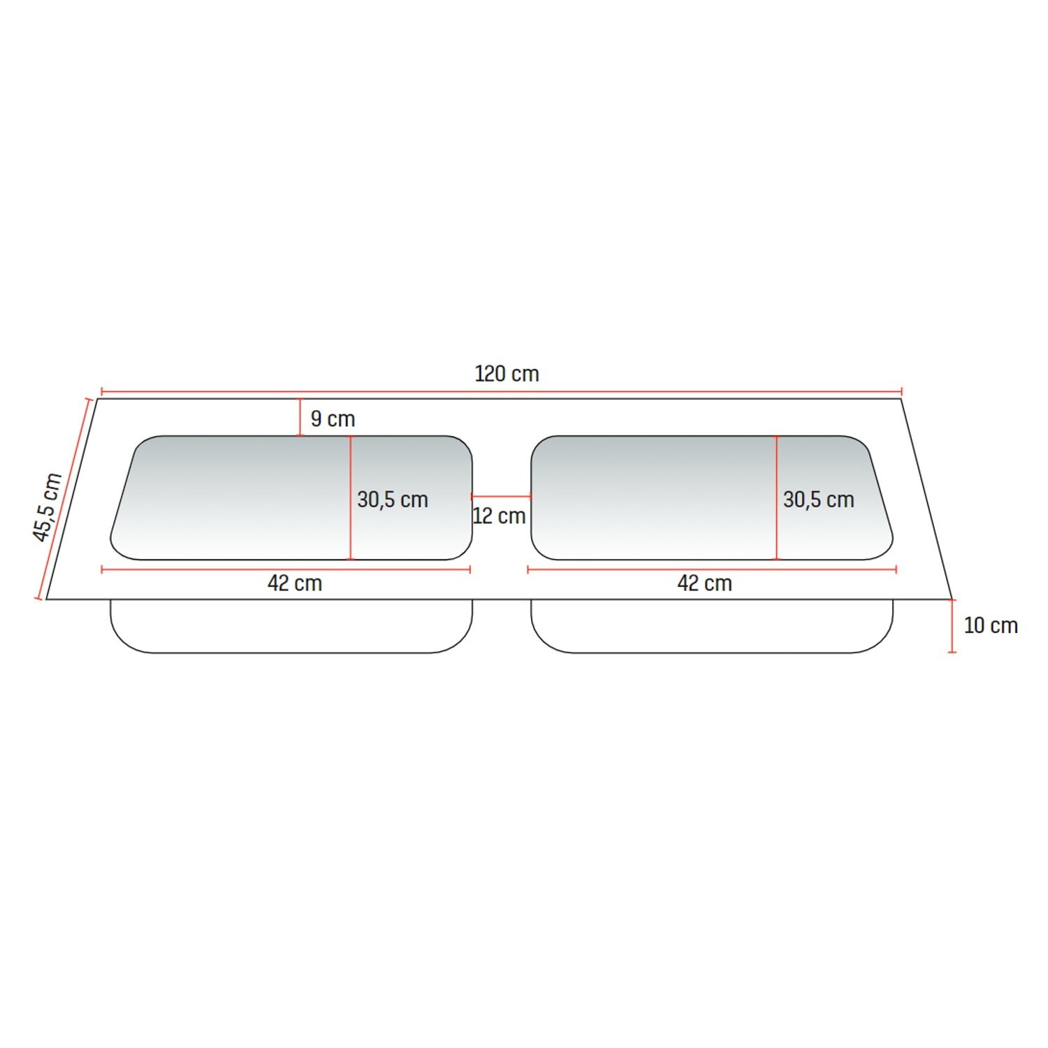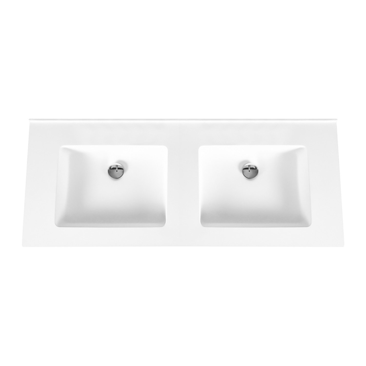 Deze wastafel is geproduceerd in de kleur wit en heeft een rechthoekige vorm. De diepte van deze wastafel bedraagt 45.5 cm cm en de breedte 120 cm. In het midden van dit artikel bevinden zich twee rechthoekige wasbakken.