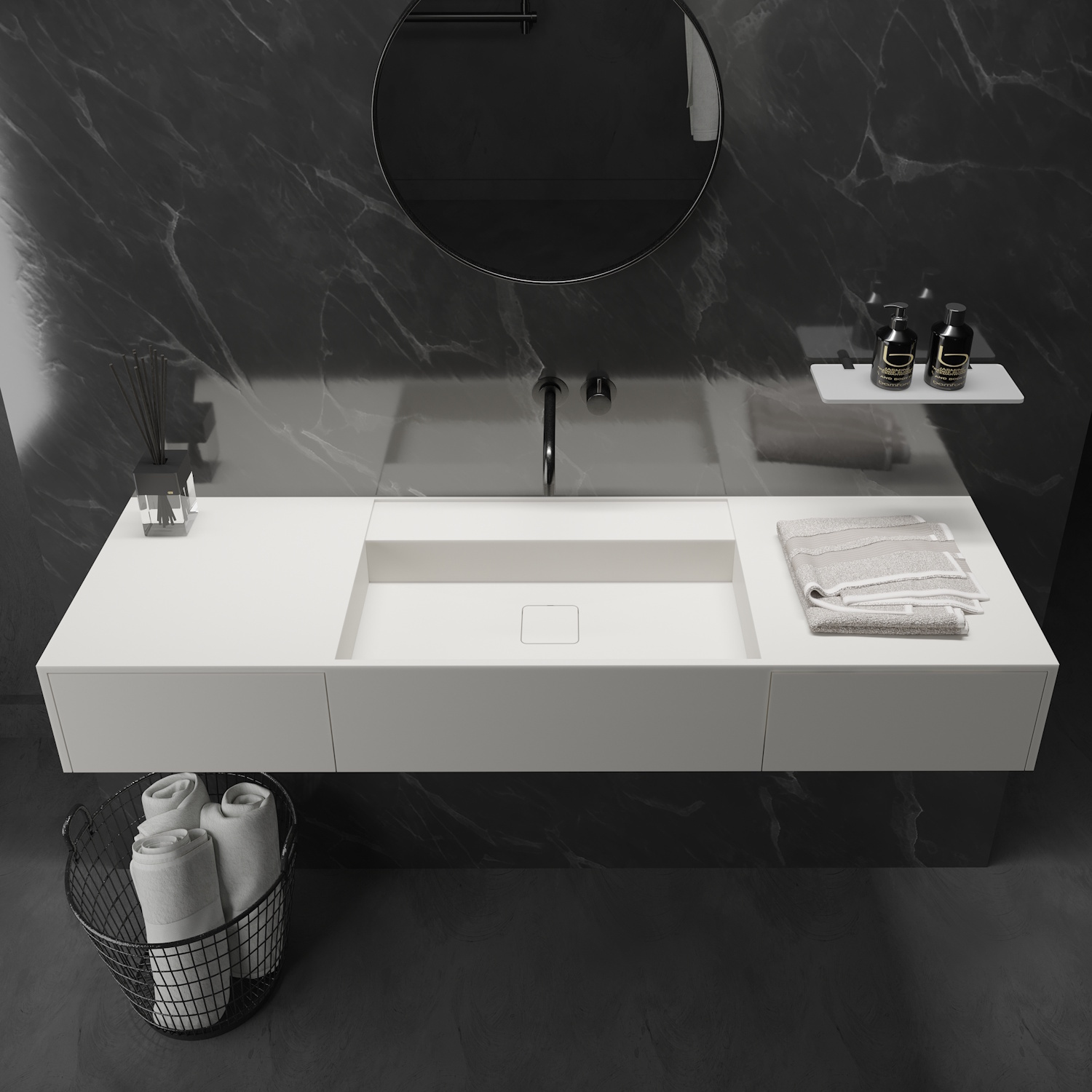 Solid Surface is uitstekend geschikt om sanitaire producten van te maken omdat het geen poriën en naden heeft. Solid Surface is een composiet, geproduceerd uit mineralen en harsen. Bovendien is dit materiaal bestendig tegen vocht, vlekken, en zelfs chemische stoffen. Er trekt dus niets in, is niet poreus en heeft een intense kleur en is gemakkelijk schoon te houden. Omdat het door en door van hetzelfde materiaal bestaat, kunnen eventuele beschadigingen weg gepolijst worden. Perfect om de hygiëne te behouden in uw design badkamer of toilet.